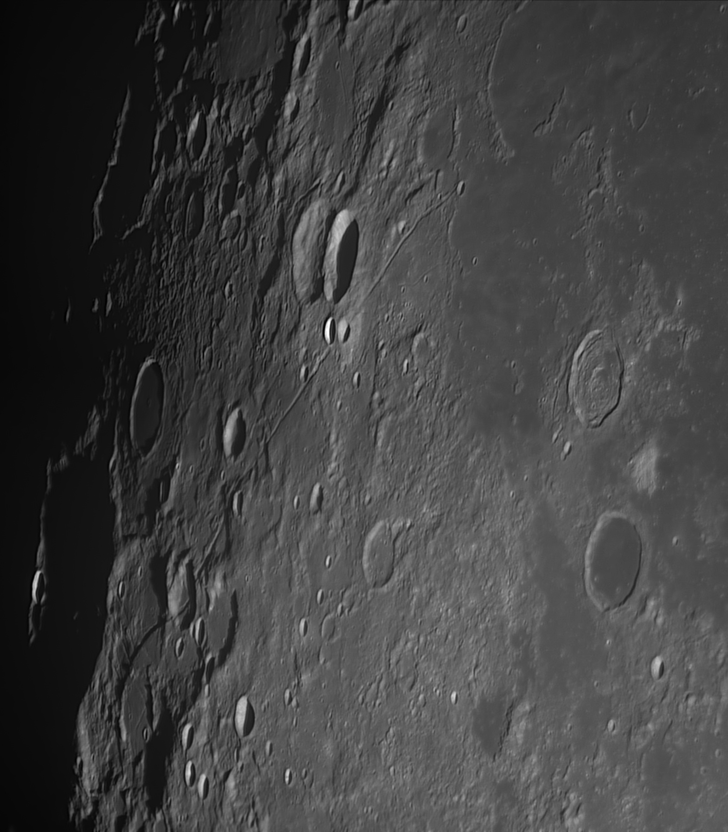 The very long and complex Rimae Sirsalis. Imaged on Oct 29, 2020 with a 355 mm Newtonian and ASI290MM in red light. Seeing 6/10 and poor transparency due to fog.
