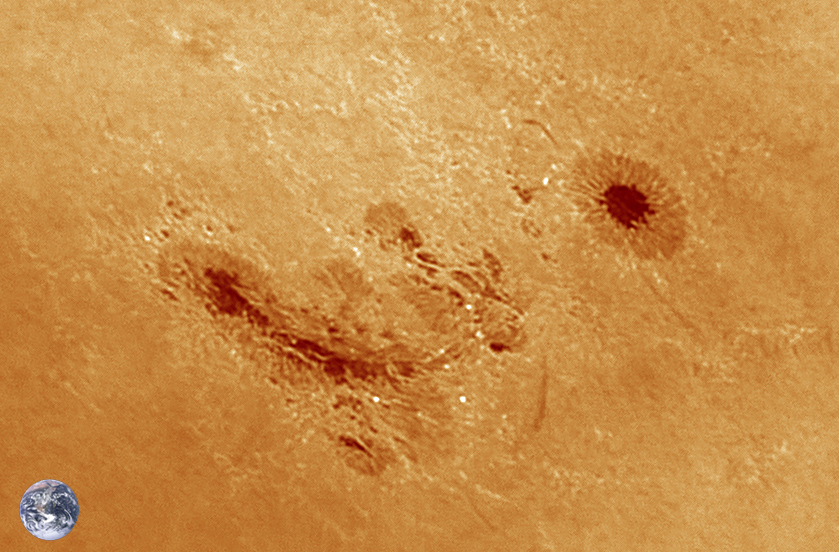 Giant sunspot AR2781 on November 5, 2020. Images acquired with a 150 mm achromat, Quark H alpha filter and ASI174MM. Fair seeing. The Earth was inset for size comparison. A second image shows also a H-alpha view, but with the filter set a bit off-band. Lots of Ellerman bombs are detectable.