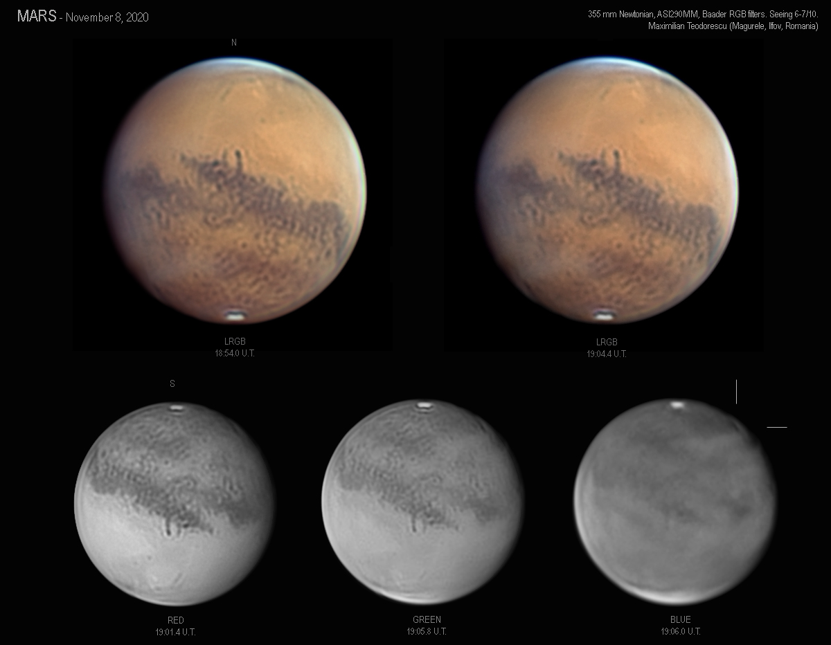 Planet Mars on November 8, 2020. Good seeing for this session. A high altitude cloud is visible on the terminator; it is marked in the Blue filter image, but it is visible in all three filters. Lots of have/clouds on the entire planet.