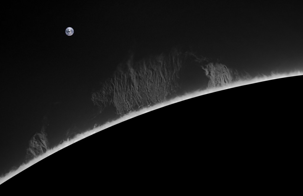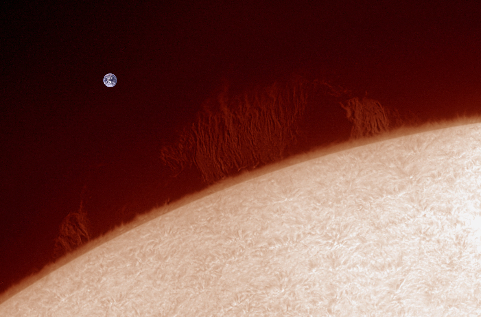 150mm refractor, Quark chromosphere H alpha filter, ASI 174MM, Seeing 6-7/10. Earth image inserted for size comparison.