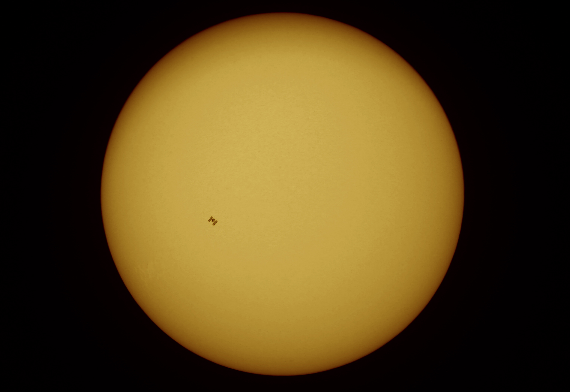An ISS transit under poor conditions. 115mm refractor, Canon 6D, Herschel Wedge.