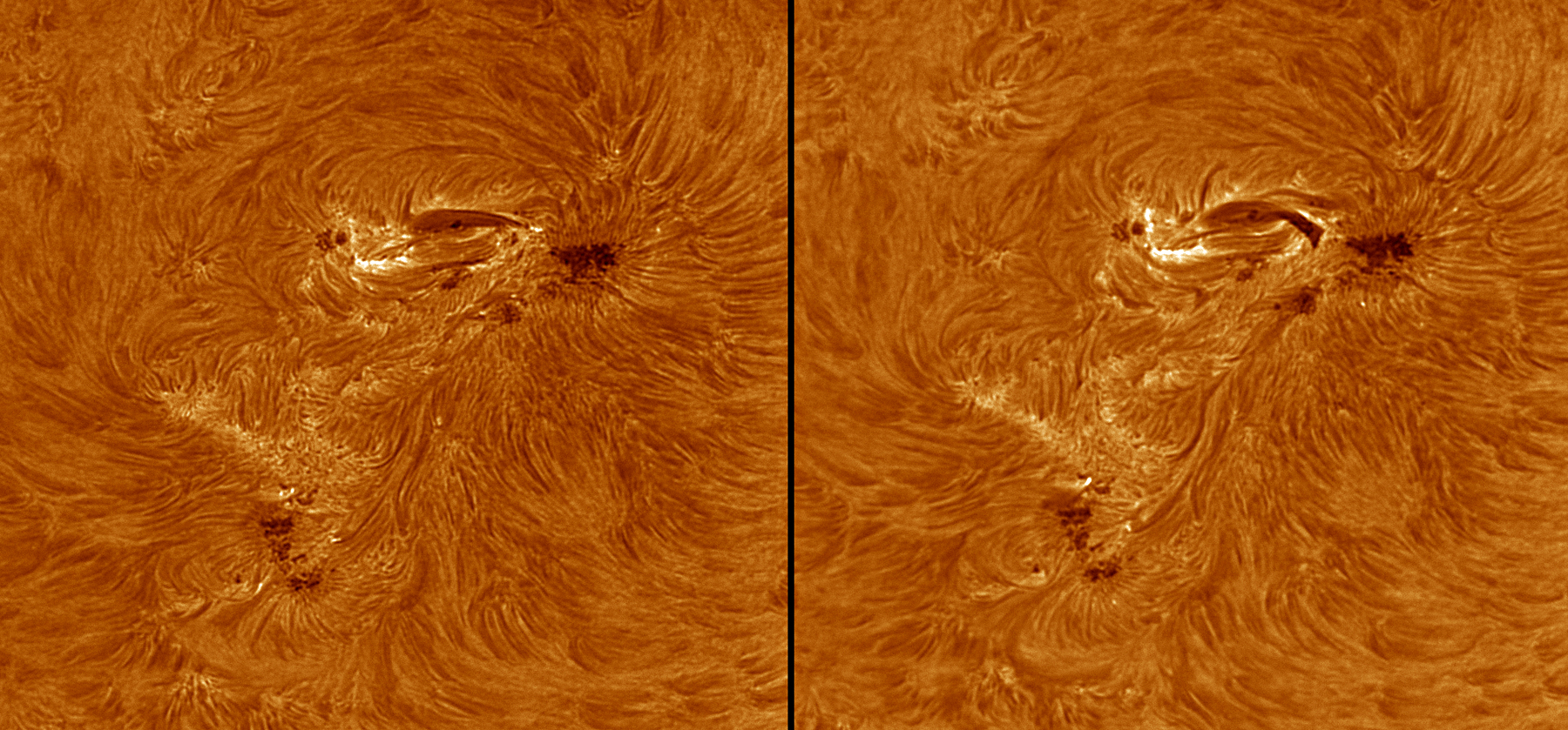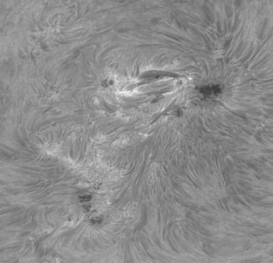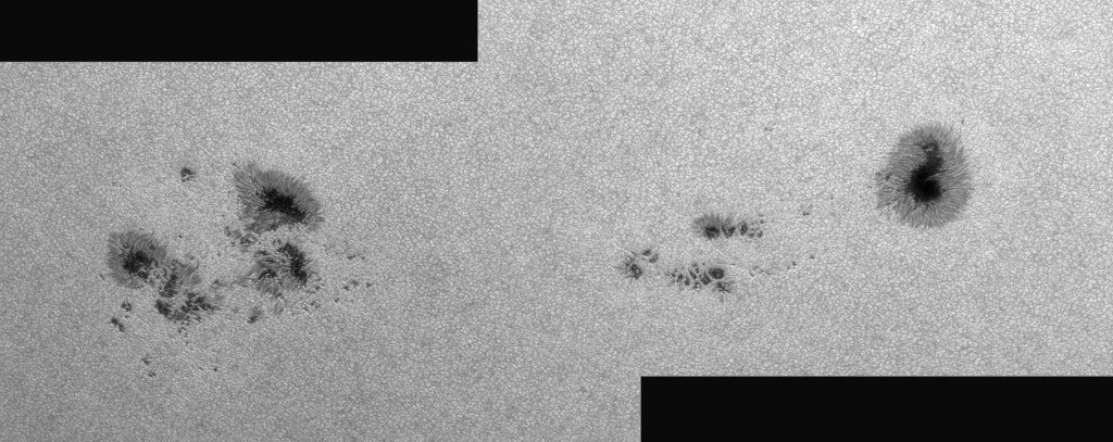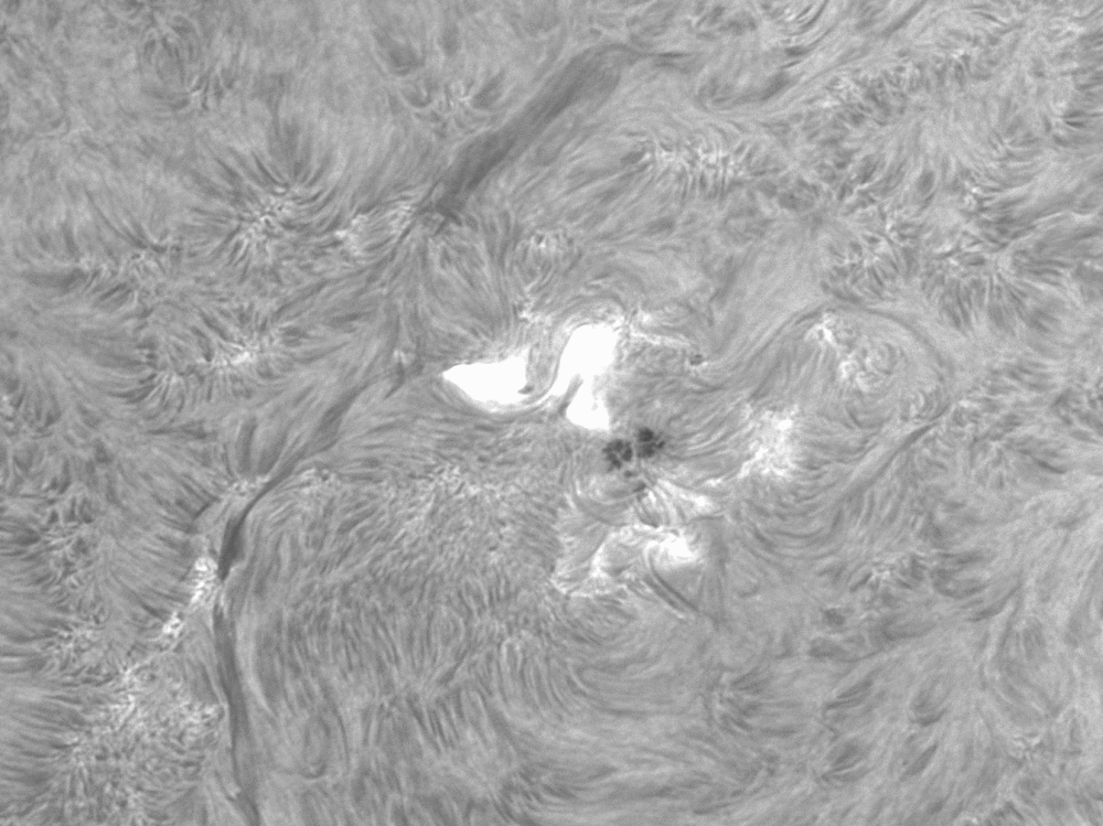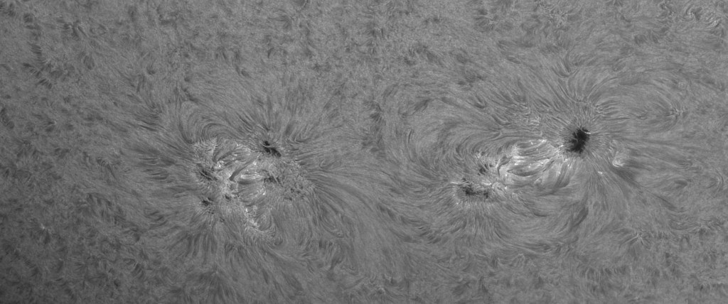 Sunspot AR2860 on August 31, in poor seeing, lots of wind, and two refractors: 228mm and 150mm. Both with Herschel wedge, H-alpha 35nm filter, Powermate 2.5x and ASI174MM.