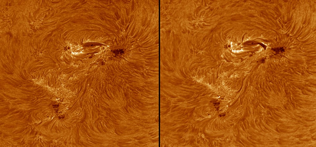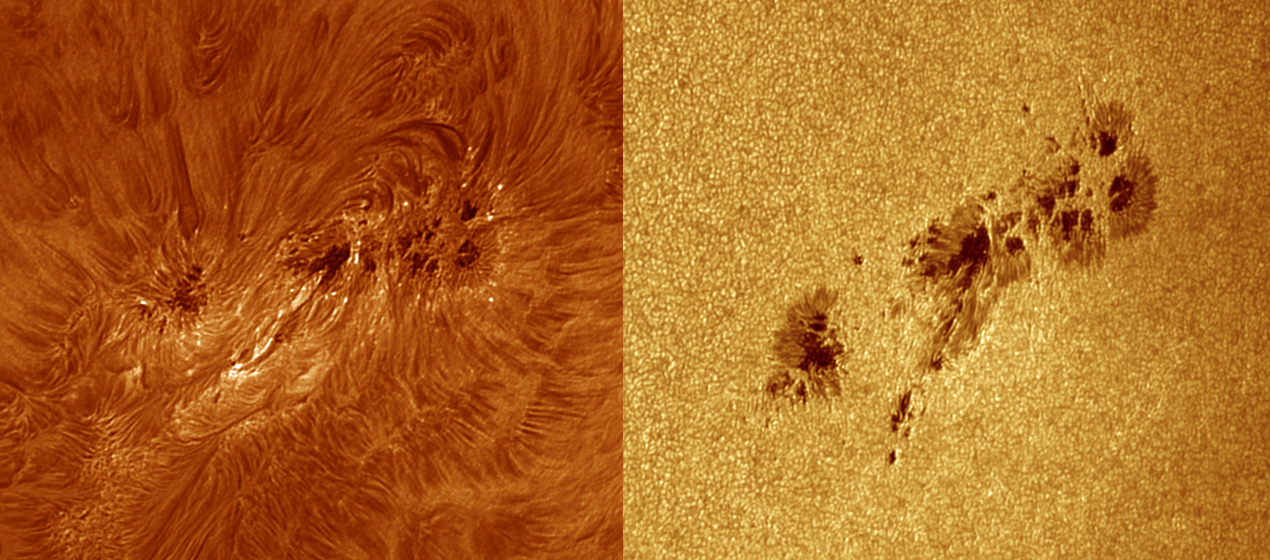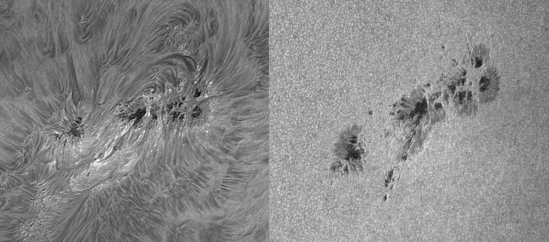 A very fresh sunspot group, September 2. Left WL image with 228mm refractor, Right H-alpha image with 150mm refractor. Both in poor/fair seeing.