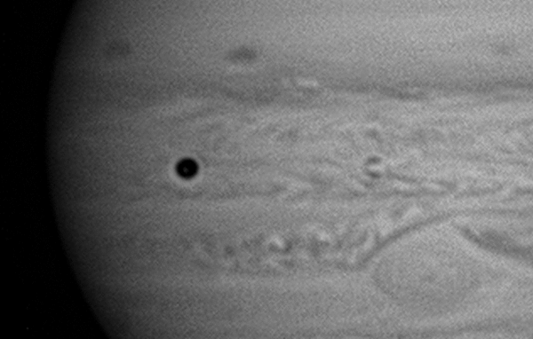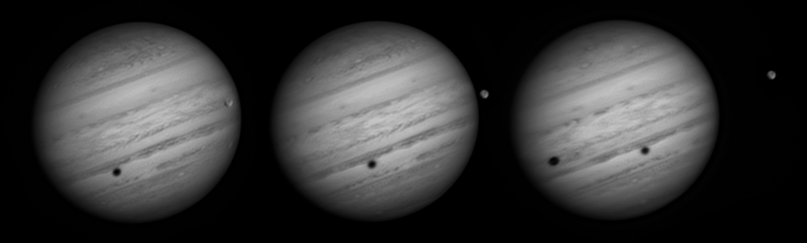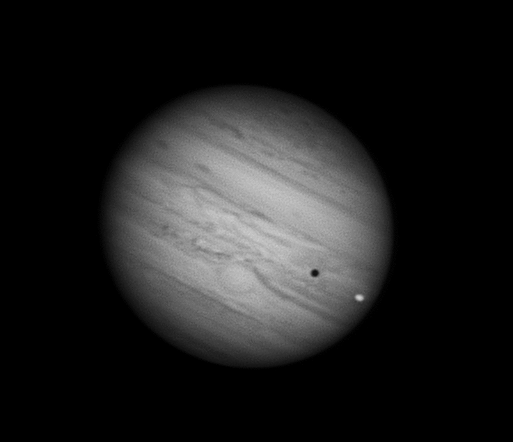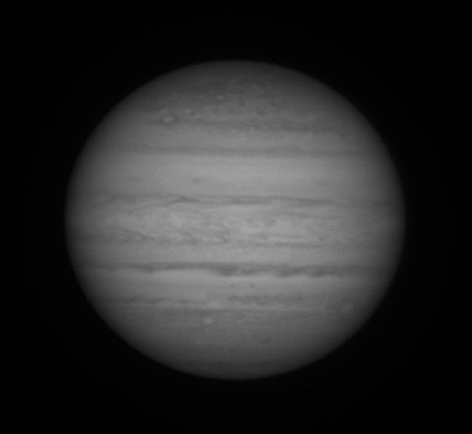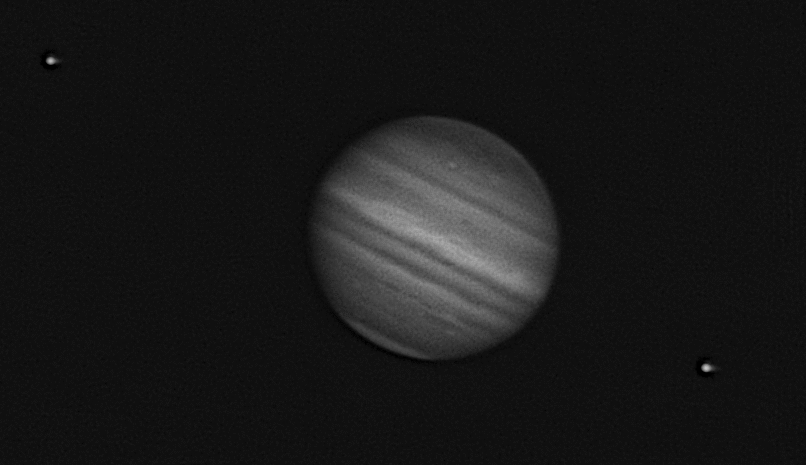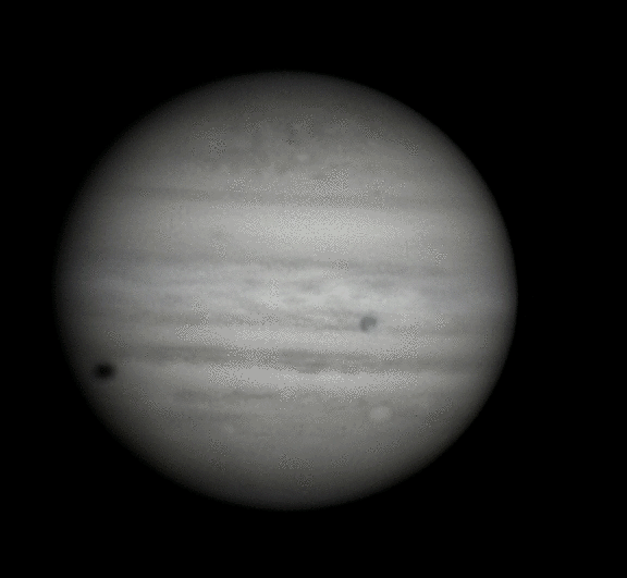 Jupiter with Ganymede and the shadows of Callisto and Ganymede. Imaged in very very poor seeing conditions on Ocotober 4. Only IR (742 nm) imaging was possible.