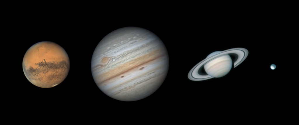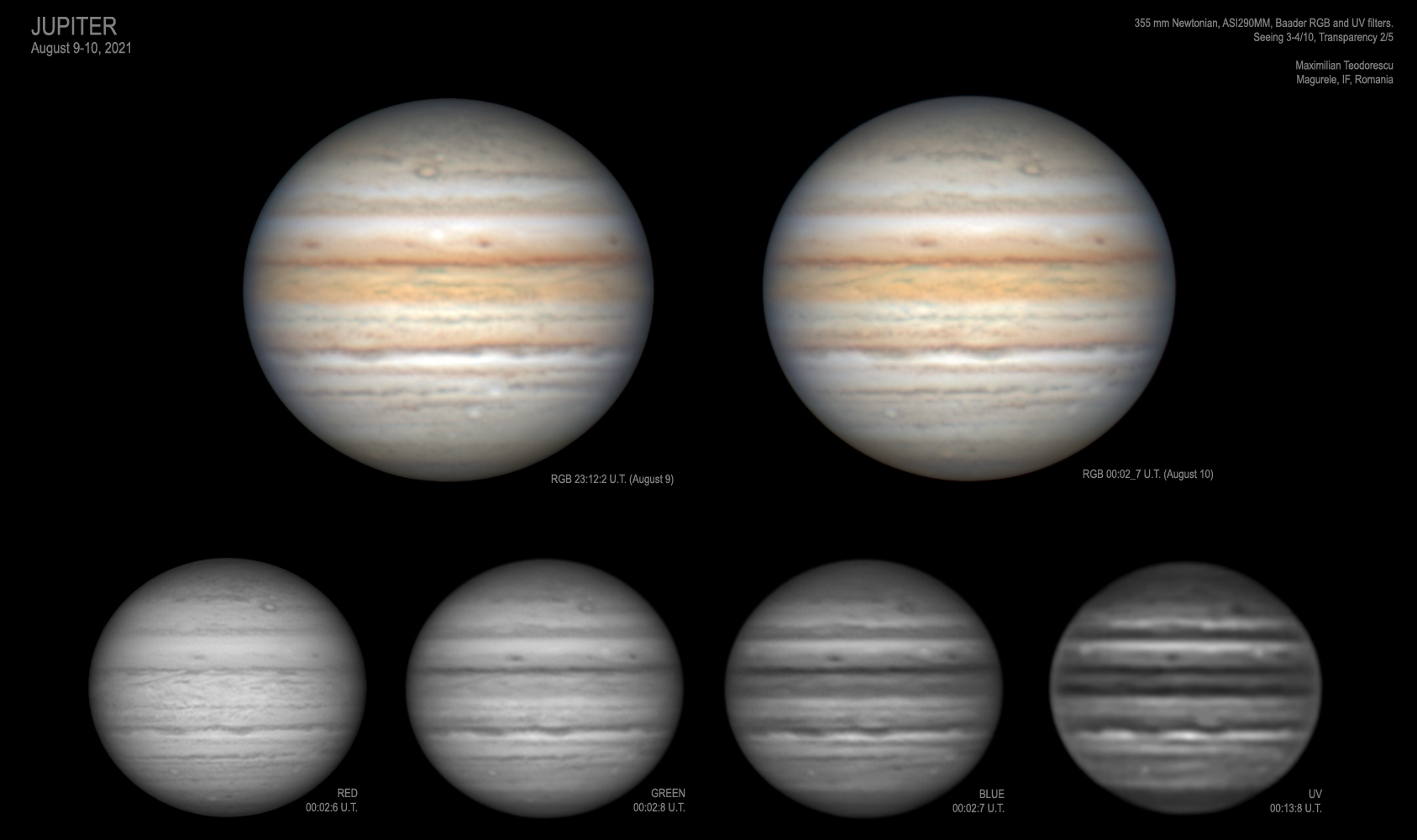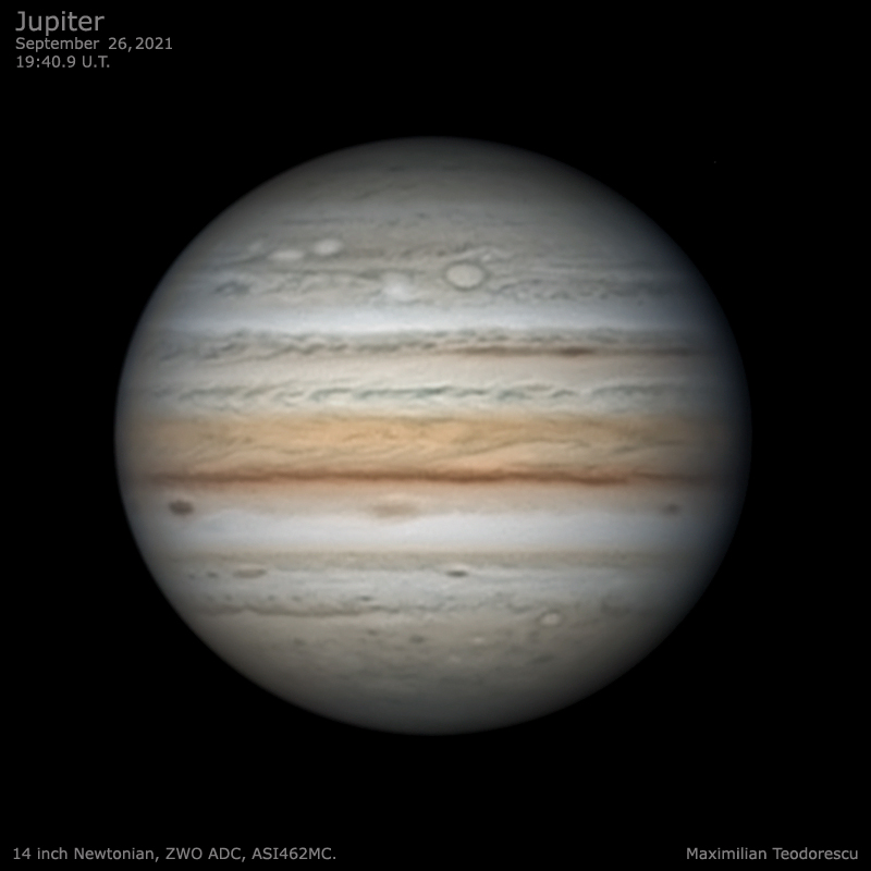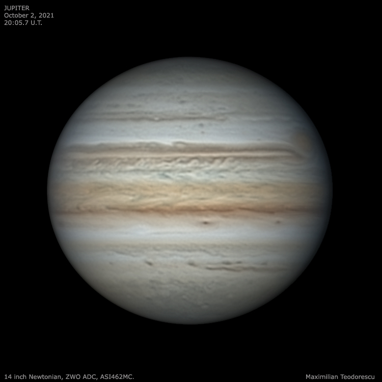 Jupiter from 2021, a collection of six images showing almost all of the planet, on different dates, so with some differences in details (spots positions, bands, etc). This year the planet was hanging low at about 30 degrees above the horizon. Next year we’ll have a plus 15 degrees in altitude for this planet, which I hope it will translate in far better shots, more suitable for a 14 inch scope 😉