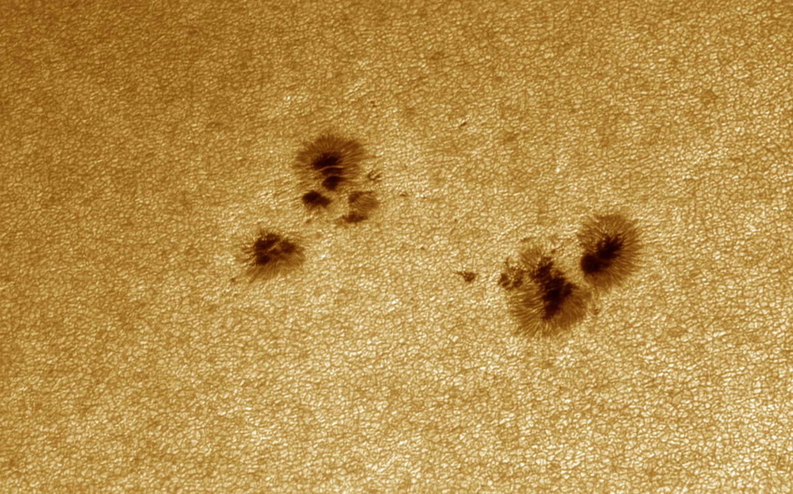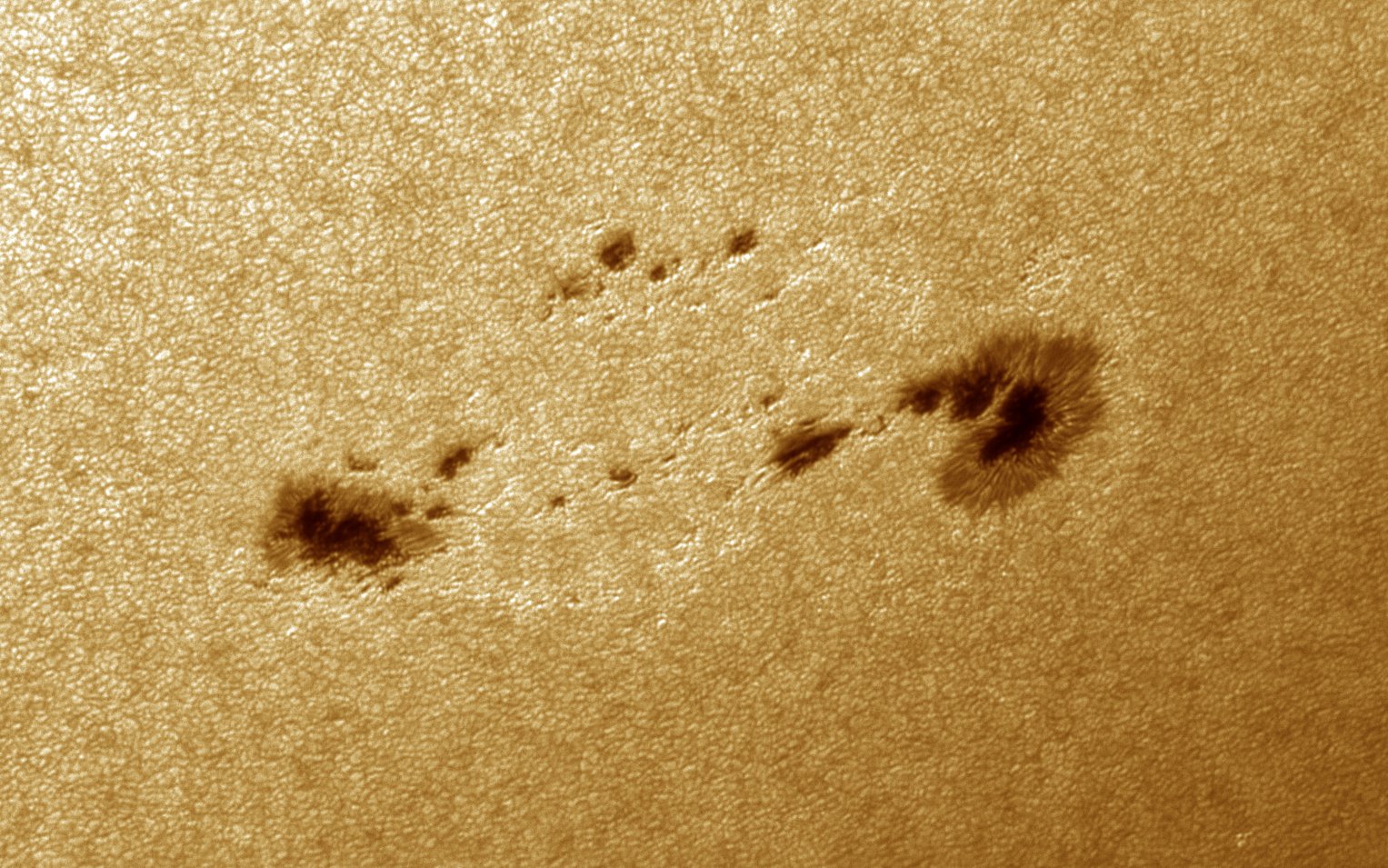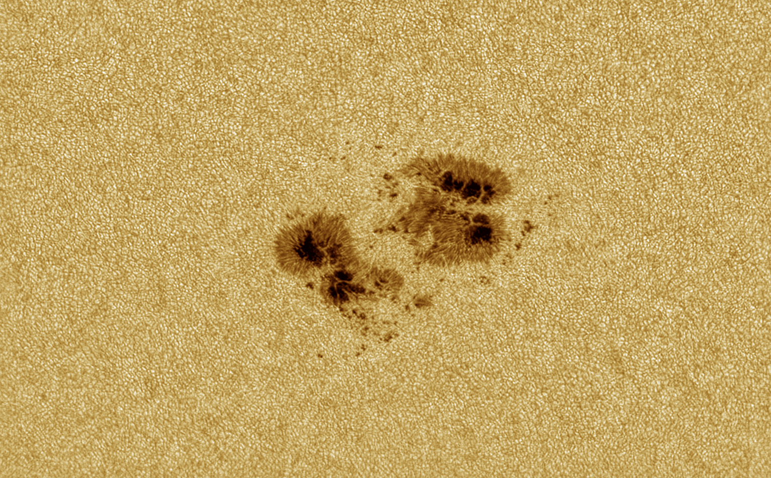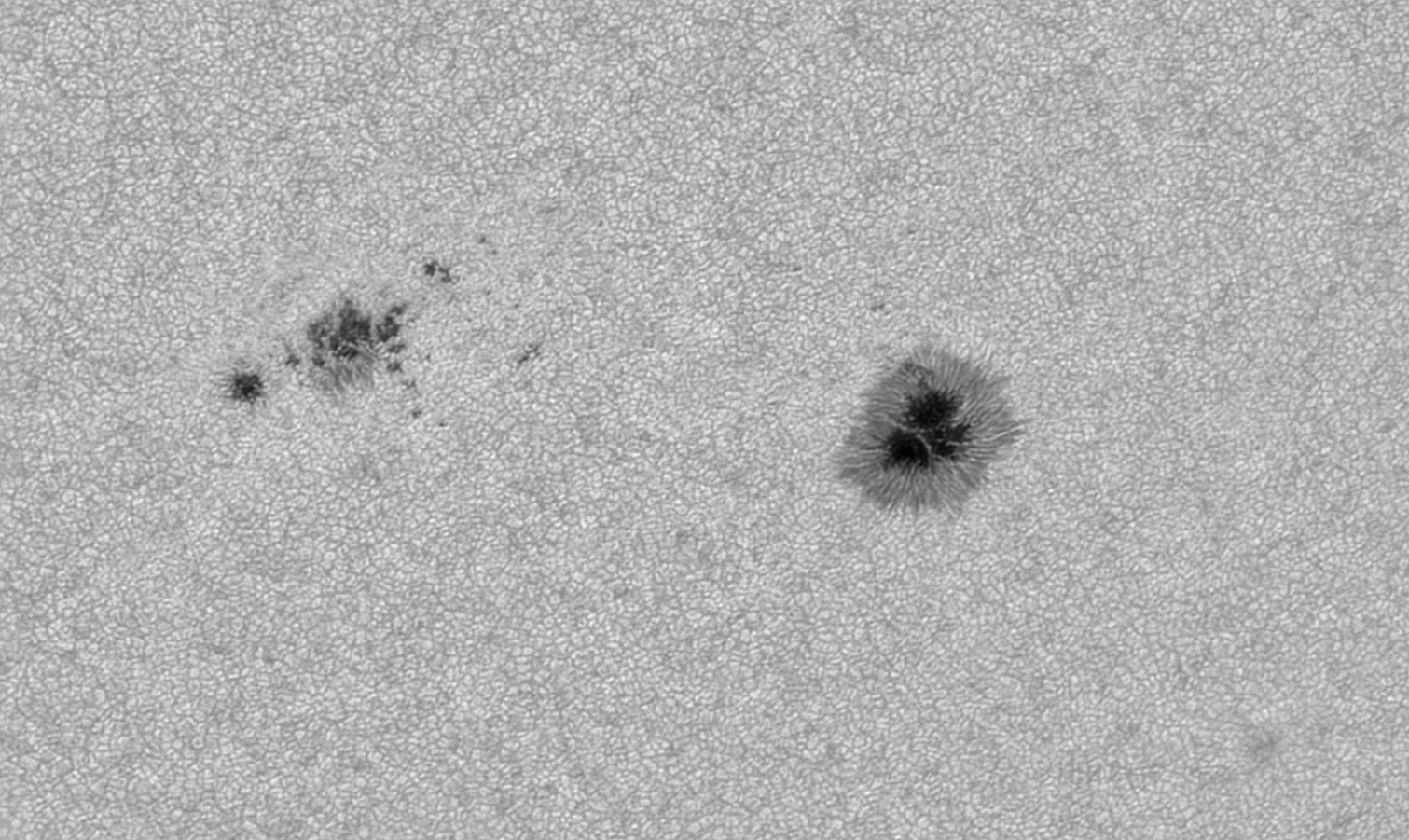 Sunspots of November 11. A brief spell of fair seeing allowed for some nice views of these sunspots and of the solar granulation, despite the low altitude of the Sun. 150 F/5.9 Achromat, Herschel wedge, Baader Continuum filter, ASI183MM.