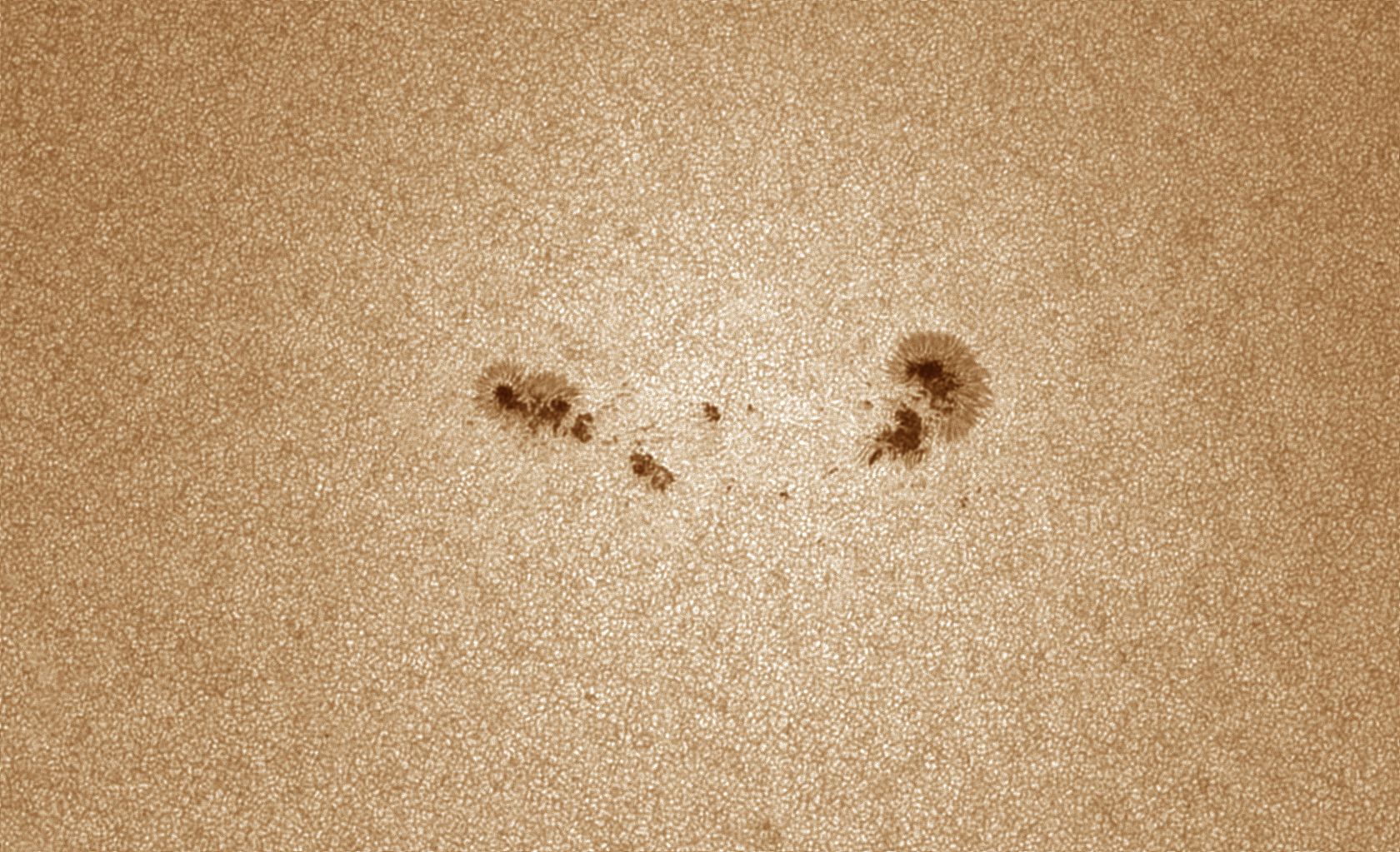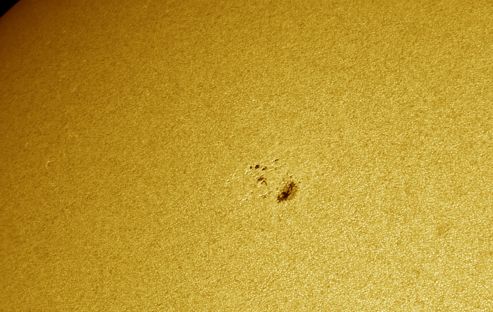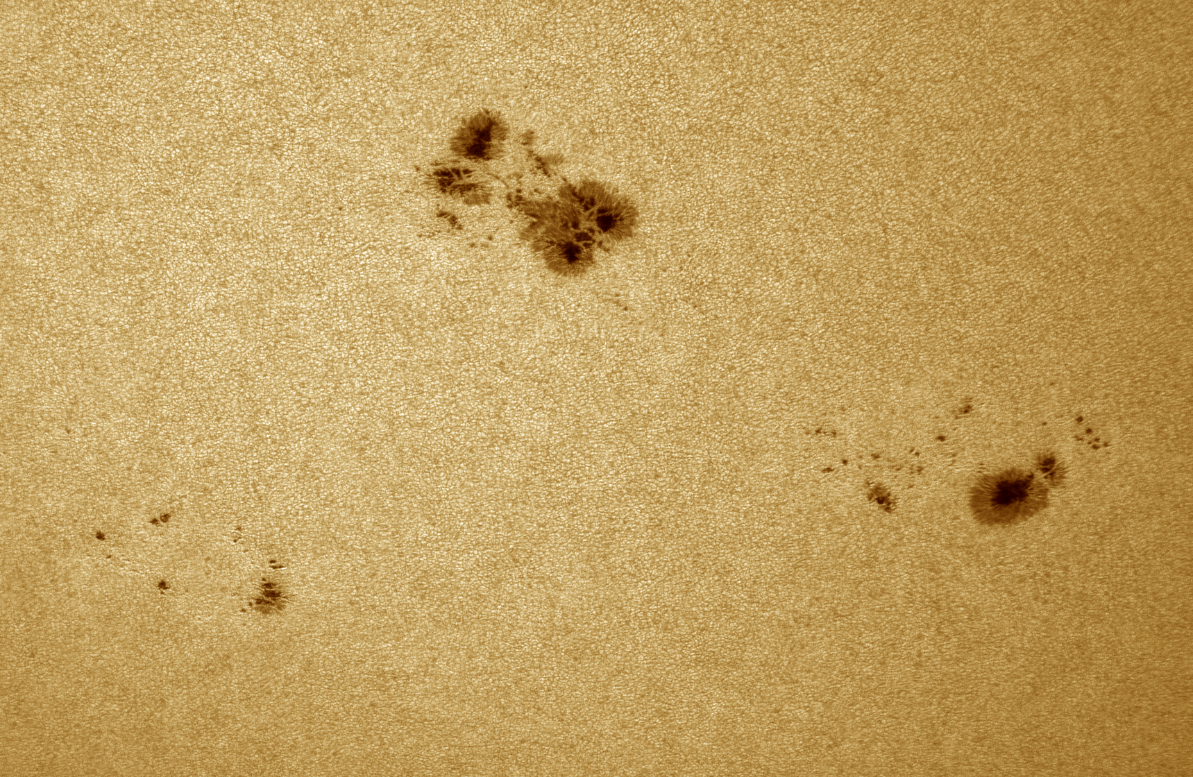 Sunspots of November 11. A brief spell of fair seeing allowed for some nice views of these sunspots and of the solar granulation, despite the low altitude of the Sun. 150 F/5.9 Achromat, Herschel wedge, Baader Continuum filter, ASI183MM.