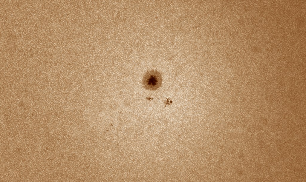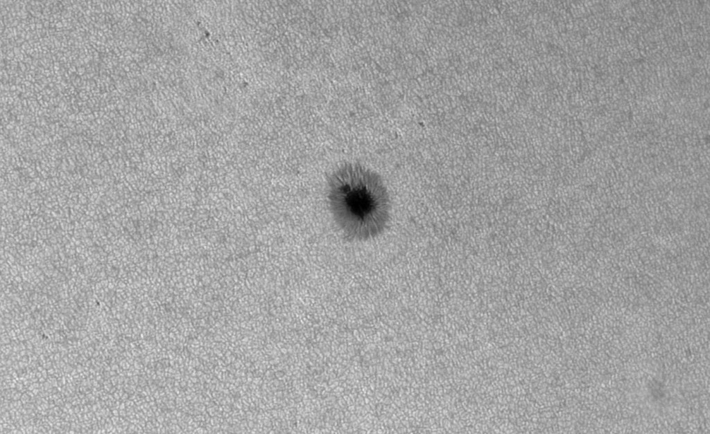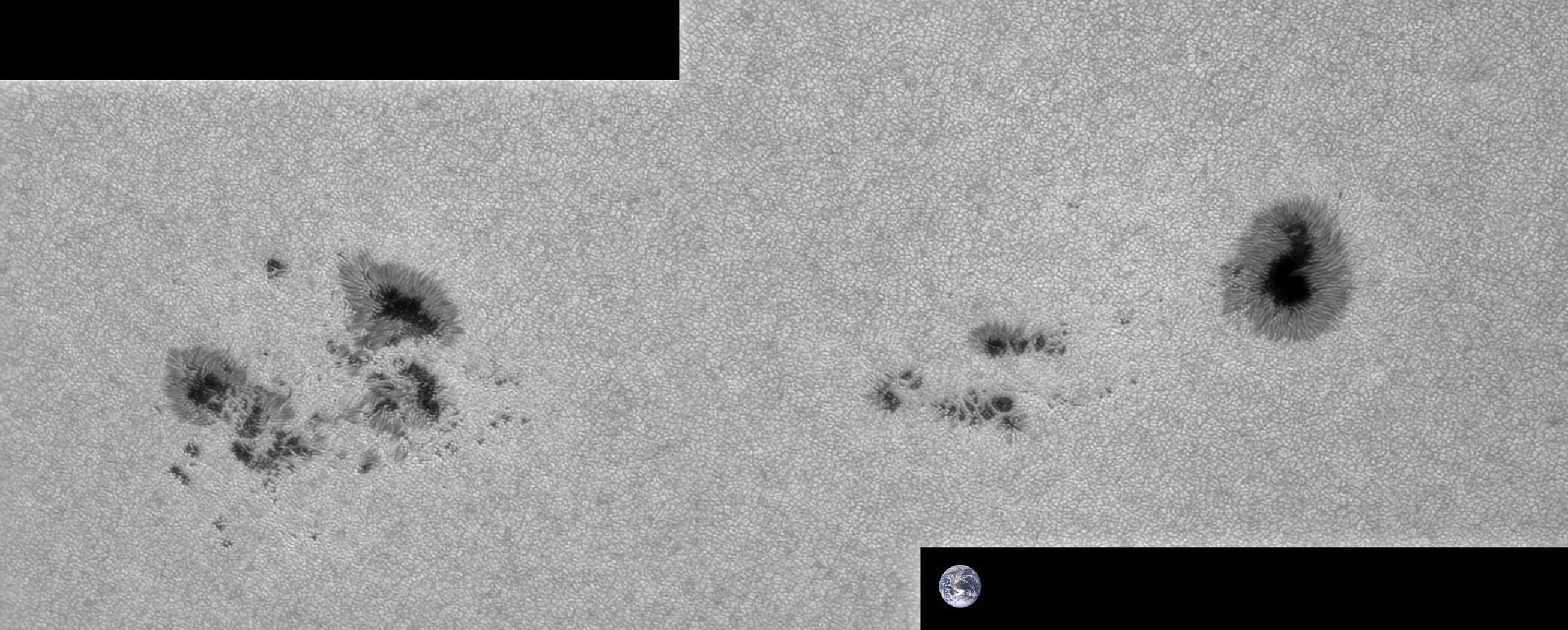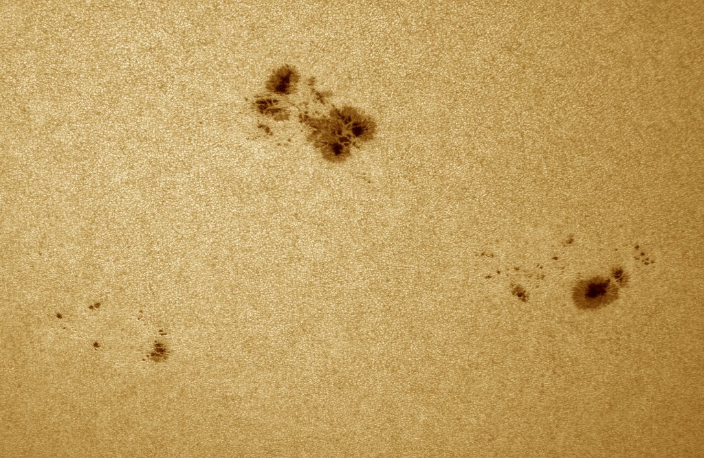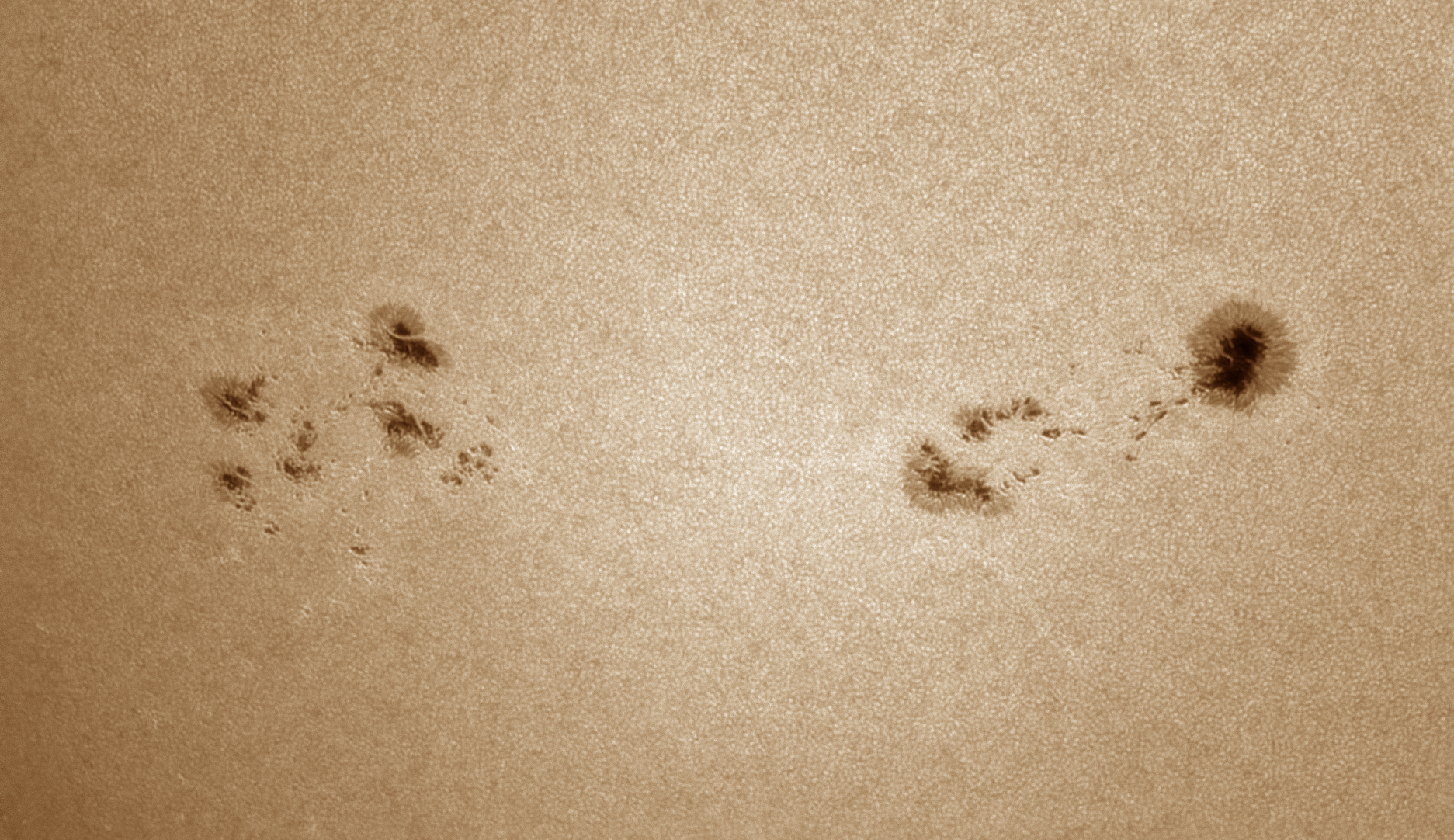 Sunspots of November 11. A brief spell of fair seeing allowed for some nice views of these sunspots and of the solar granulation, despite the low altitude of the Sun. 150 F/5.9 Achromat, Herschel wedge, Baader Continuum filter, ASI183MM.
