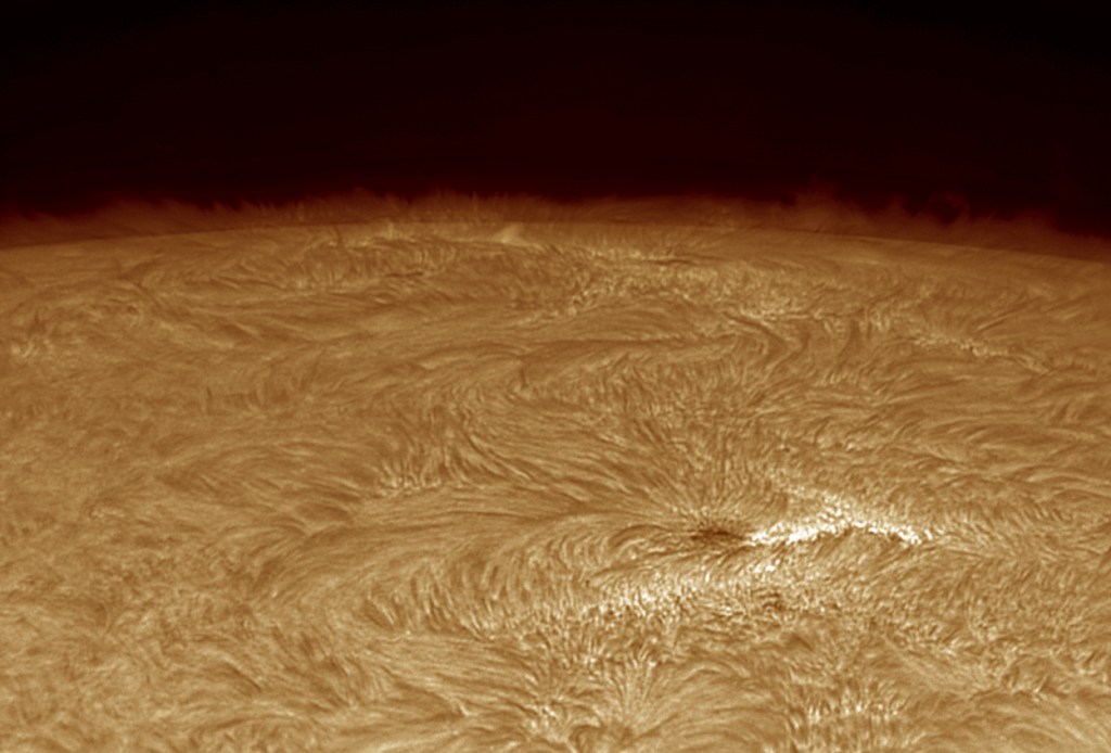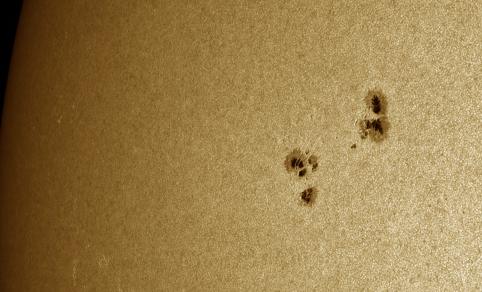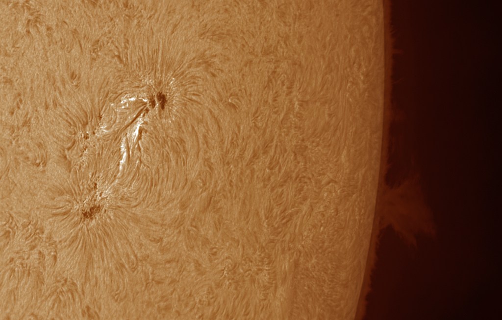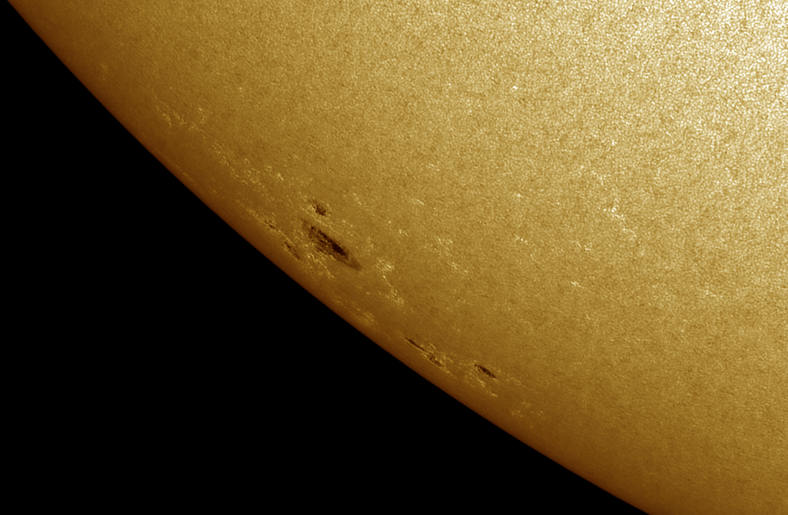 Sunspots AR2866 and AR2868 towards the solar limb. 228mm refarctor, Quark Chromosphere, ASI174MM. Seeing 5-6/10.