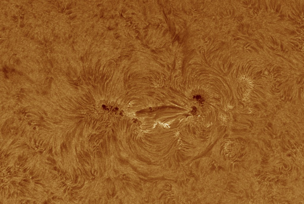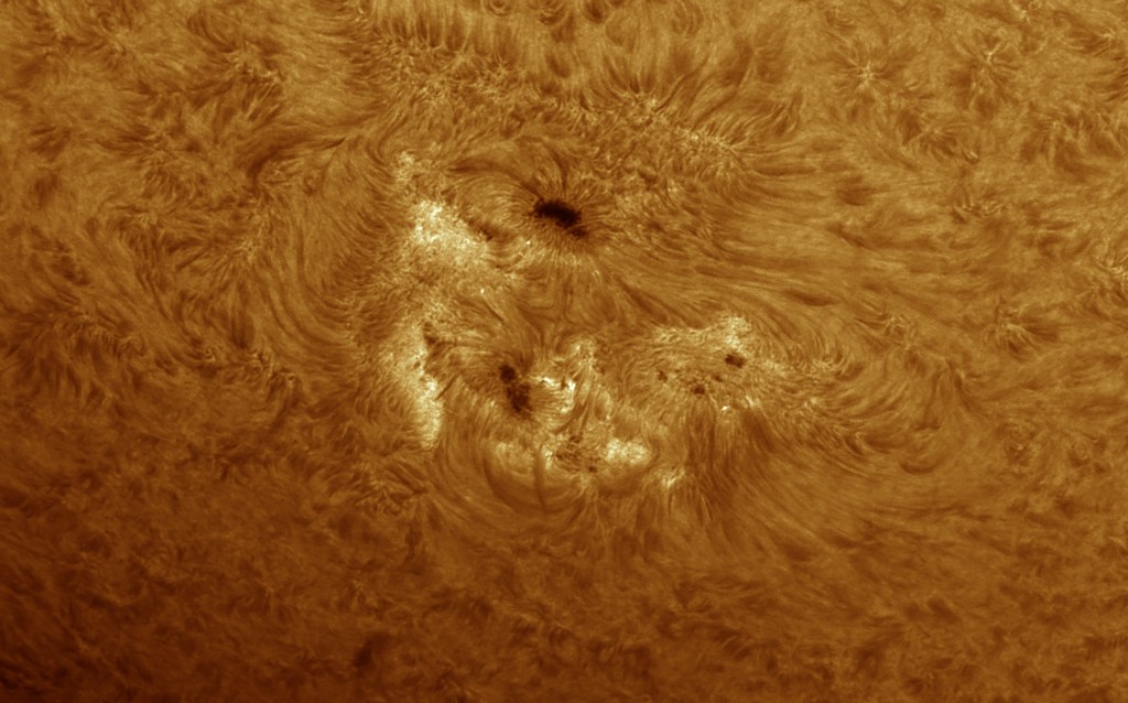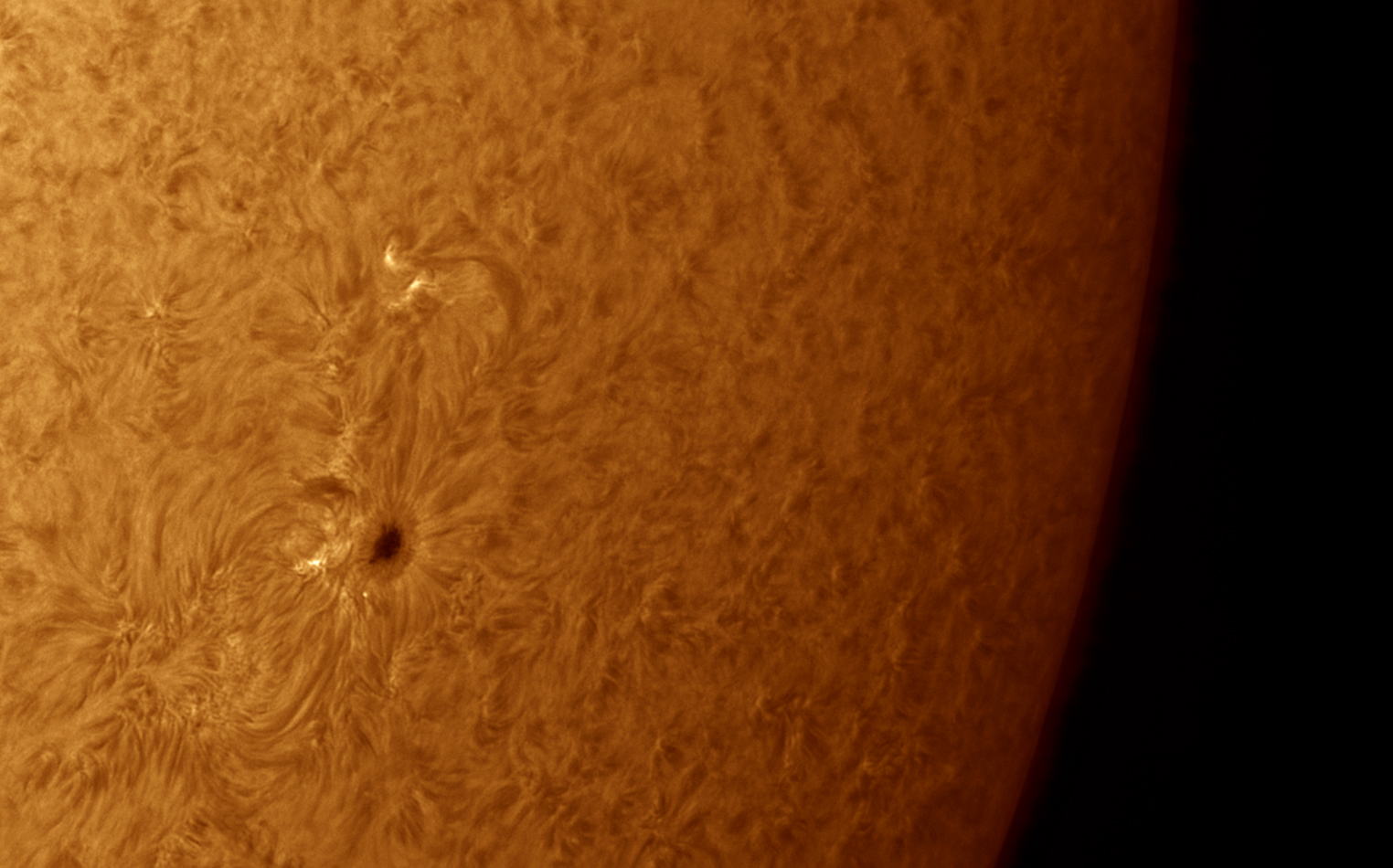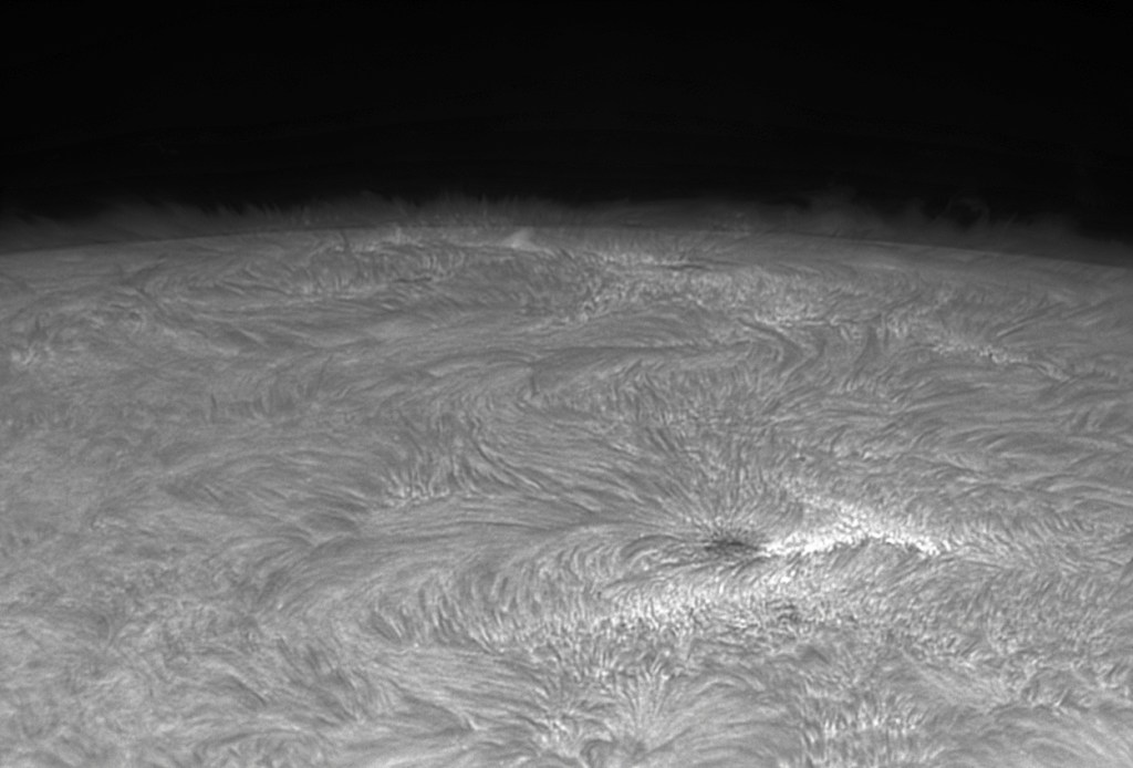 Sunspots AR2866 and AR2868 towards the solar limb. 228mm refarctor, Quark Chromosphere, ASI174MM. Seeing 5-6/10.