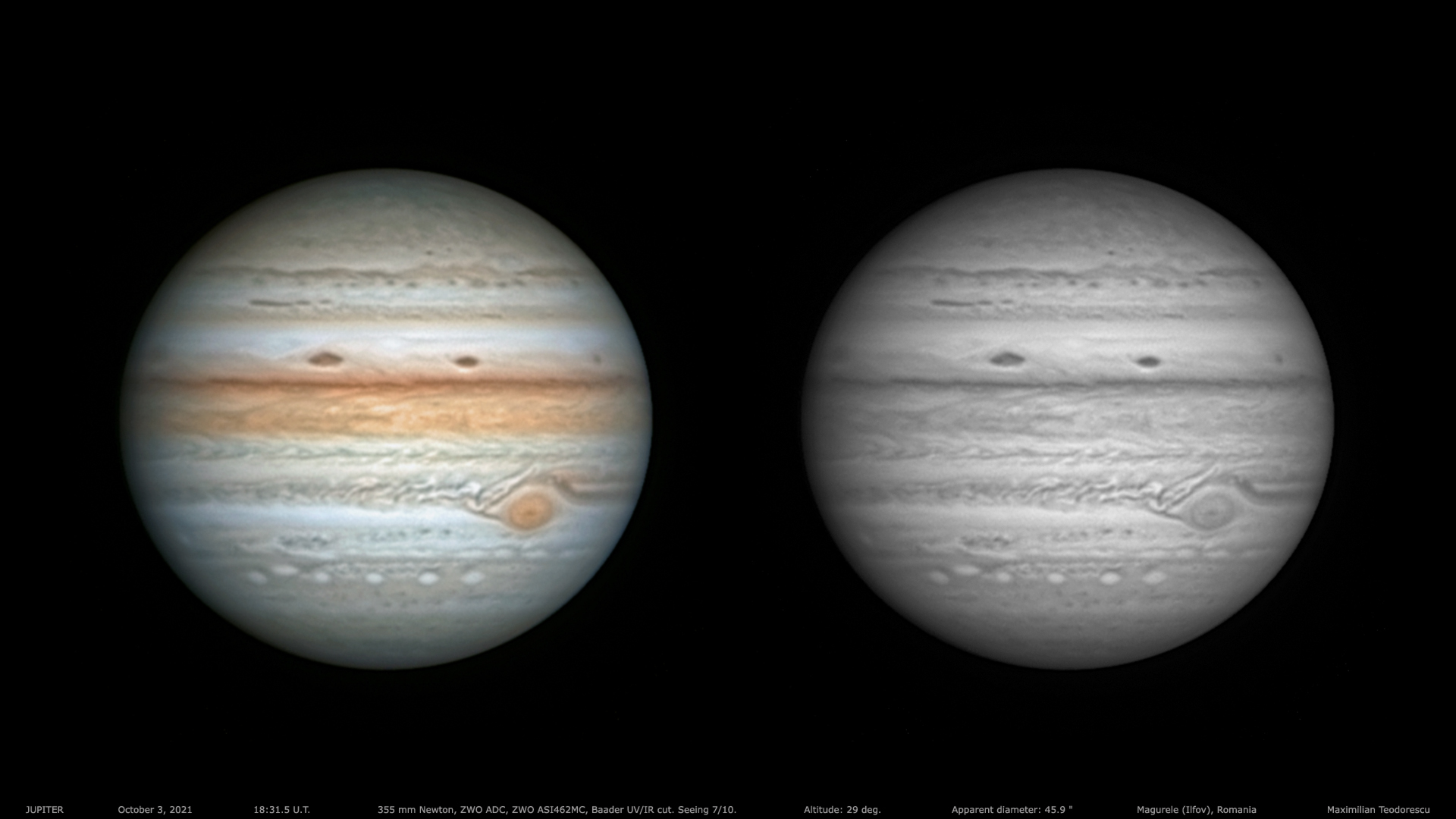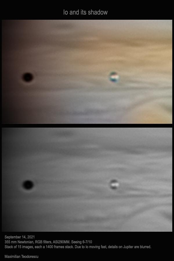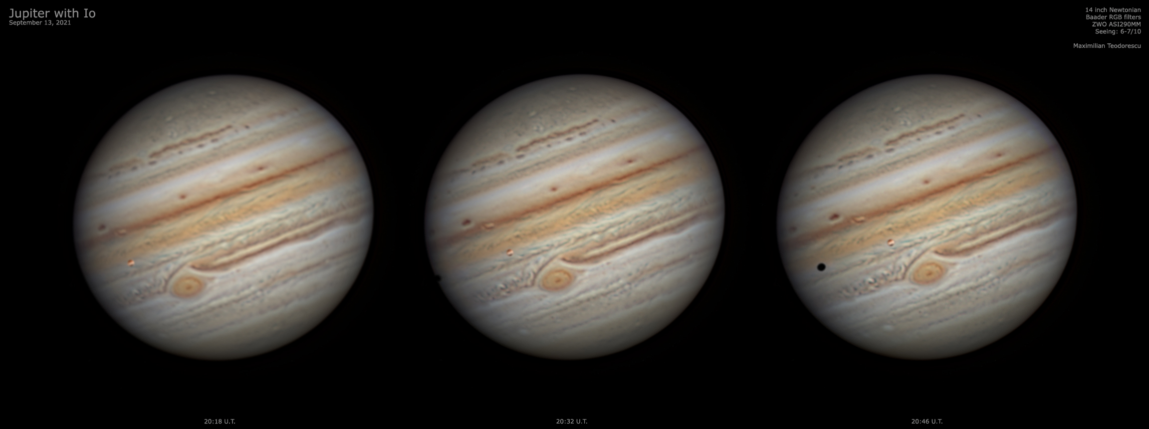 Jupiter on September 13 with the 355 mm Newtonian in very good seeing. Red filter images here, showing both Io and its shadow.