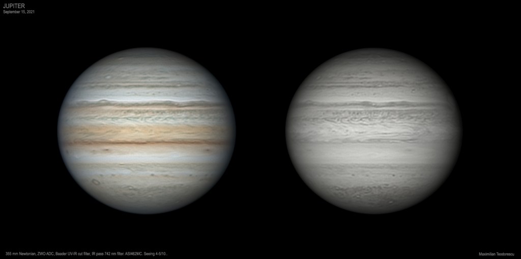 Jupiter in infrared light on September 16. Note the way the GRS is pulling matter inside it, with a spiral detectable inside it. 355 mm Newtonian, 742 nm IR filter, ASI462MC. Poor seeing.