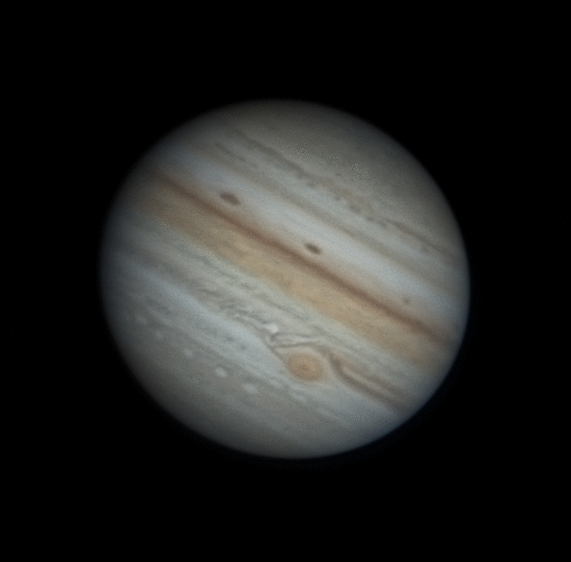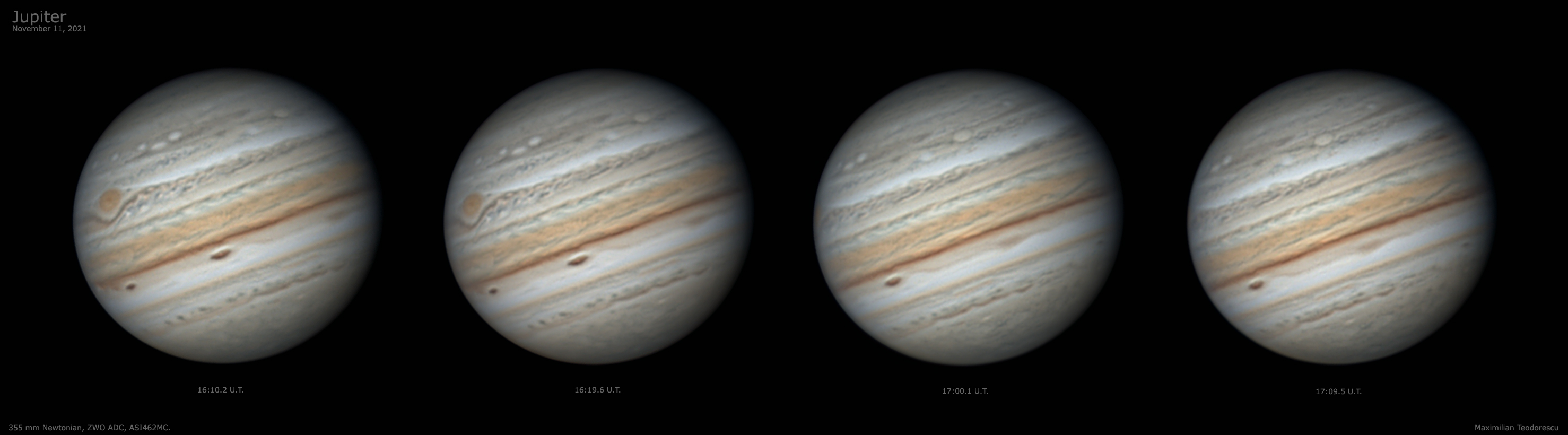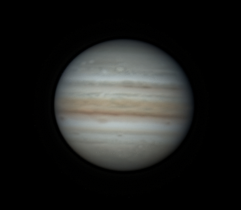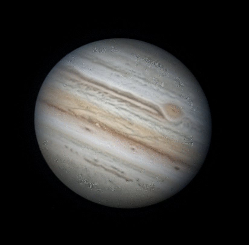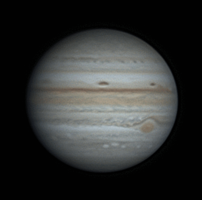 Jupiter from the night of November 11 under good seeing for the altitude. The GRS and Oval BA are seen. This animation shows about 1.5 hours of the planet’s rotation. 355 mm Newtonian, ASI462MC with ZWO ADC.