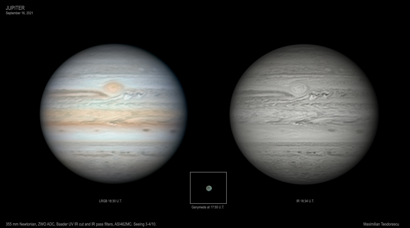 Jupiter on September 16 under very poor and poor seeing conditions. The GRS is seen. Ganymede also shows some details despite the seeing conditions.