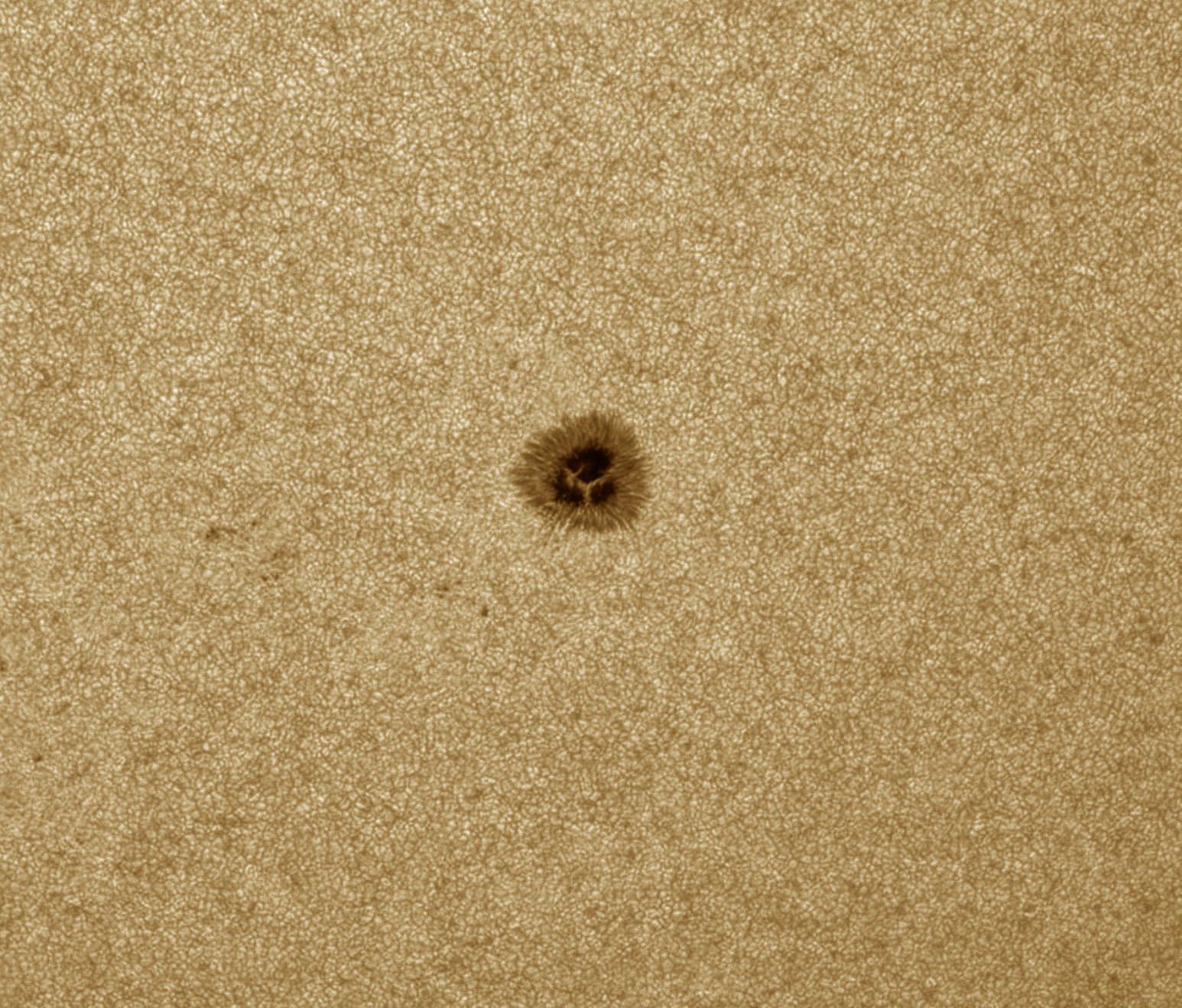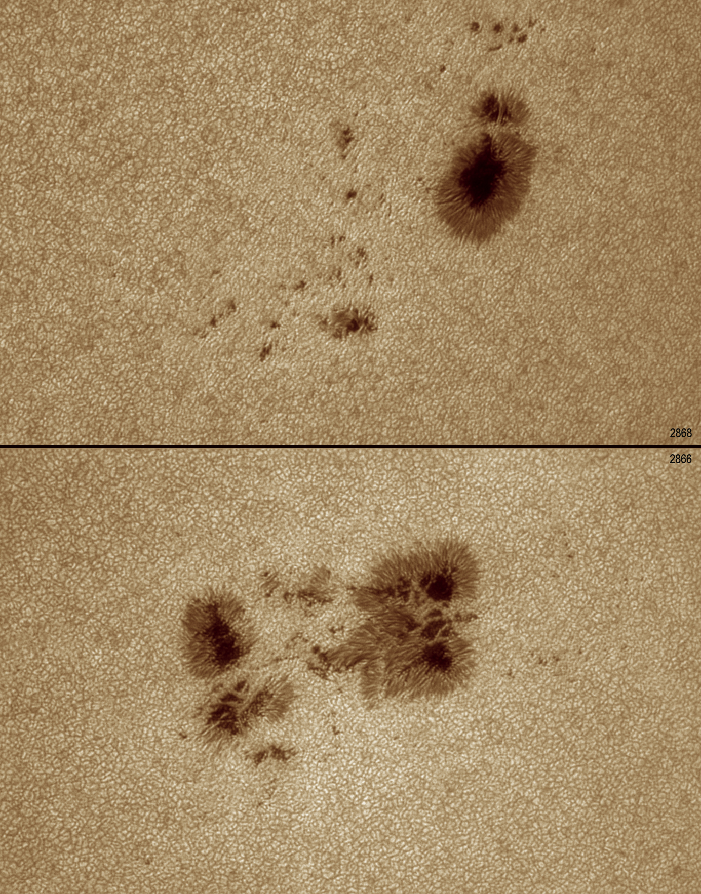 Sunspots 2866 and 2868 on September 7 with the 228 mm refractor in fair seeing. H-alpha 35nm filter, ASI174MM, Baader 2″ Herschel prism.
