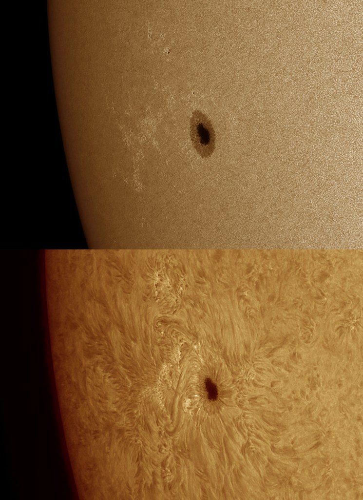 Sunspot 2886 on October 22. A two-image animation showing the differences between White Light and H-alpha details.