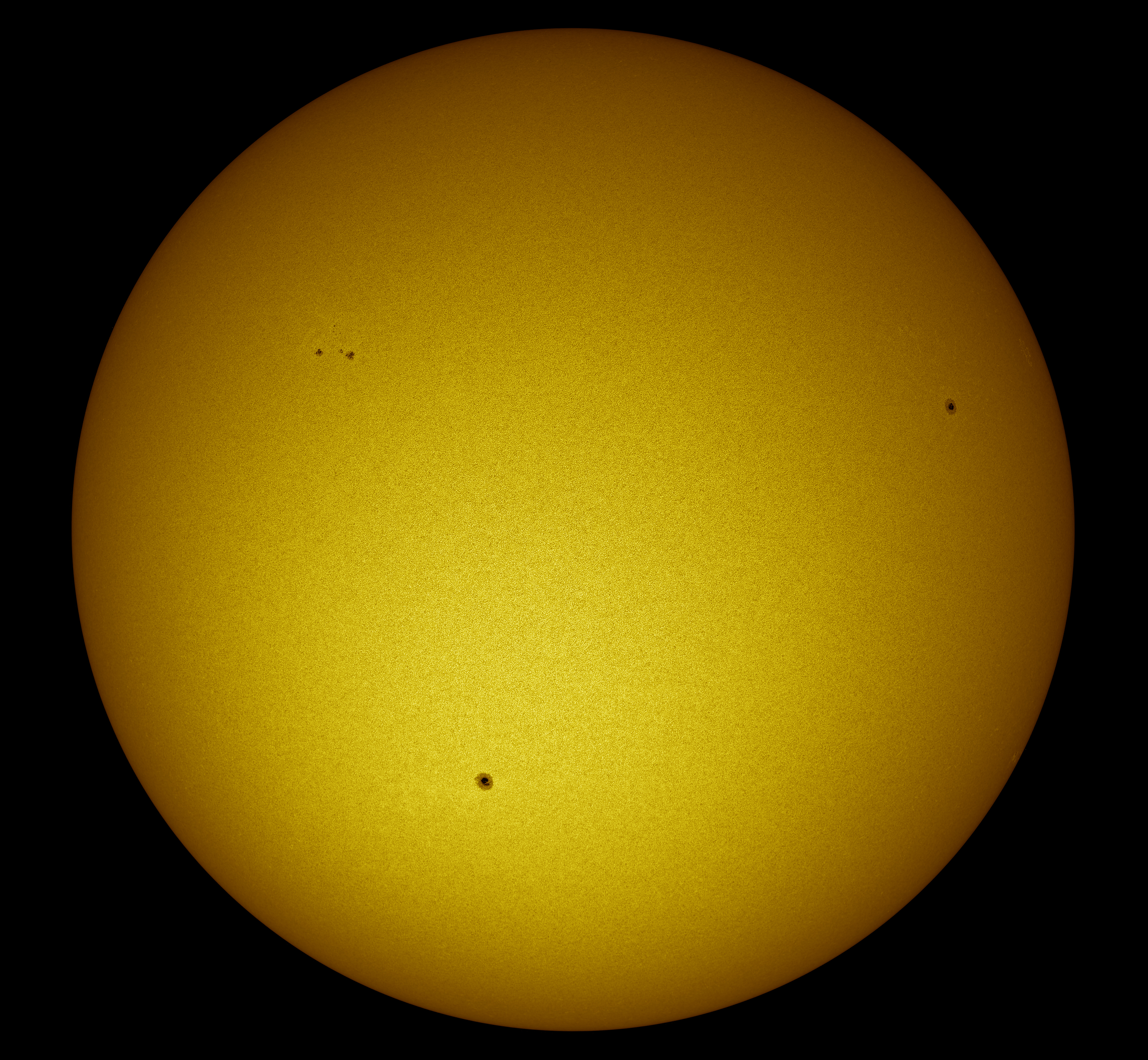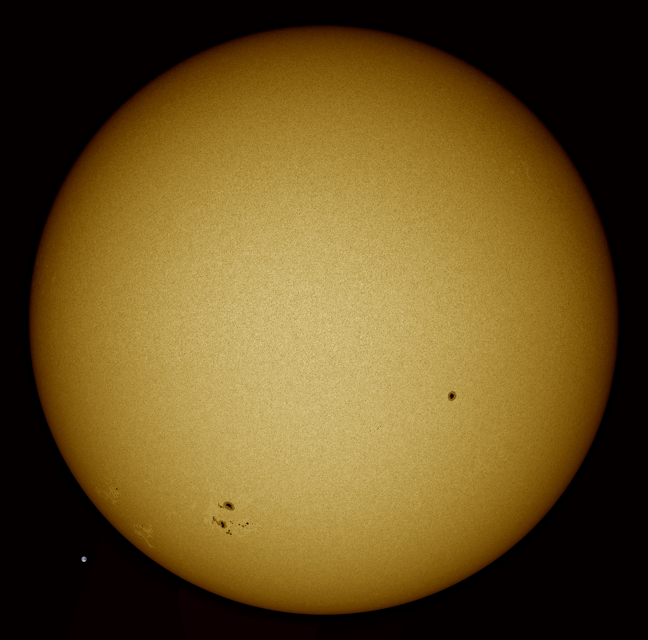 Full disc solar image of November 10, 2021. This was acquired during testing of a new setup: 150 mm F/6 TS Achromat and ASI183MM with Herschel wedge and Solar Continuum filter. 300 frames out of 3000 in poor seeing.
