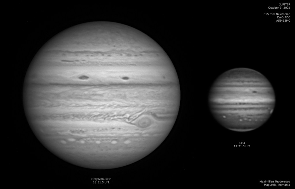 Jupiter in Methane on September 12. A 12 minute imaging run using a CH4 filter, 355 mm Newtonian and ASI290MM in poor to fair seeing. Io is at right, while Europa at left.