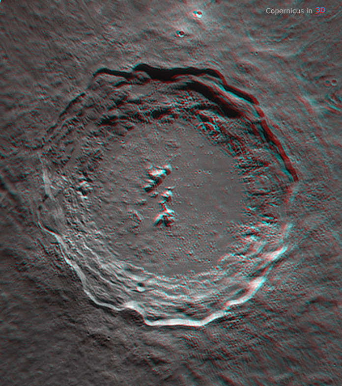 3D Copernicus: a red-cyan glasses 3d image of the lunar crater Copernicus made up from two images from October 21, 2019 and October 28, 2021. Both images acquired using a 355 mm Newtonian, Green filter, and ASI174MM and ASI290MM cameras. Seeing very good to excellent. An animation of the two frames below.