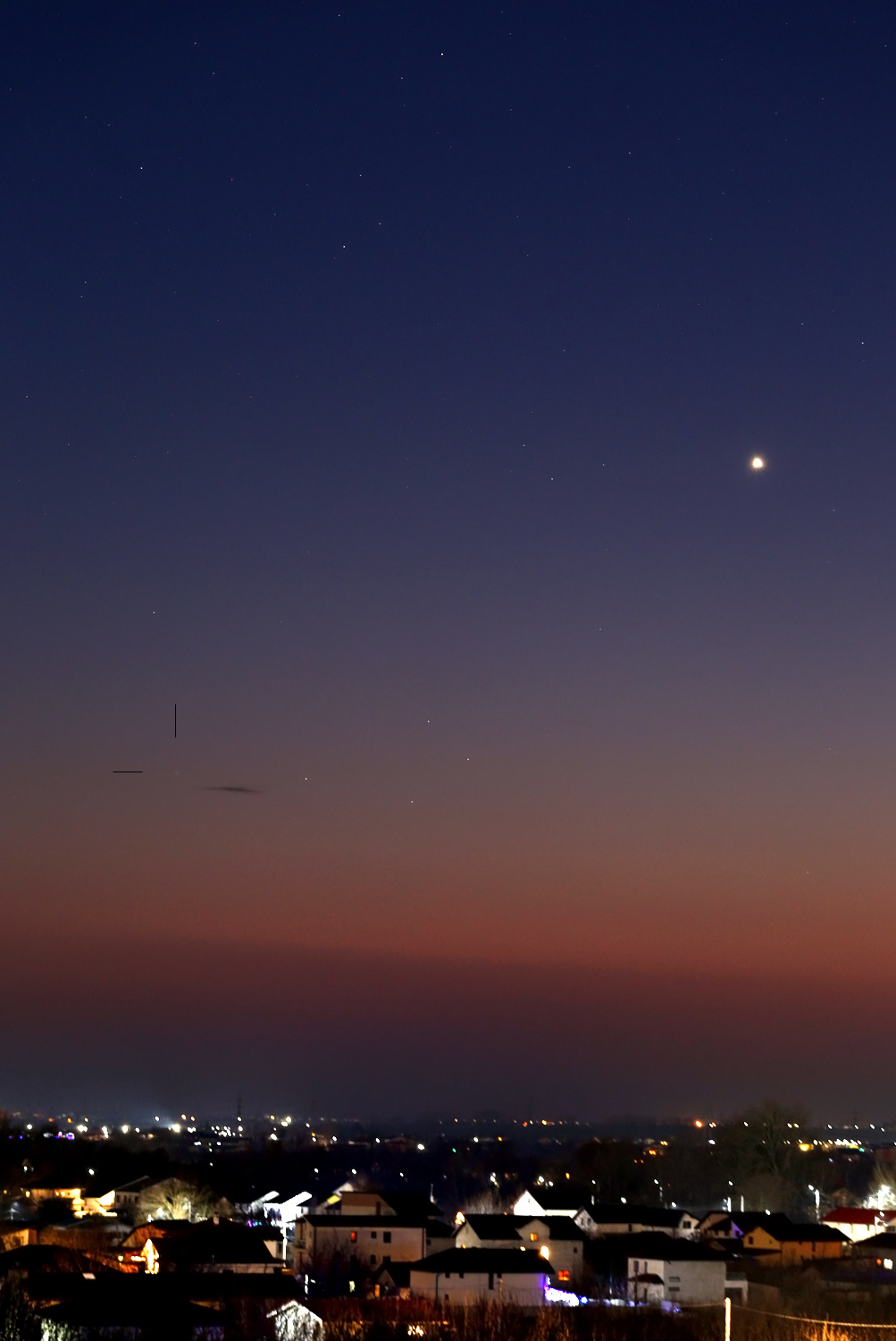 Comet C/2021 A1 (Leonard) on the evening of December 19, 2021. From a very light polluted location, suburban sky, with the Full Moon also rising in the North-East. Comet position marked by two black lines. Planet Venus is the bright star at upper left.