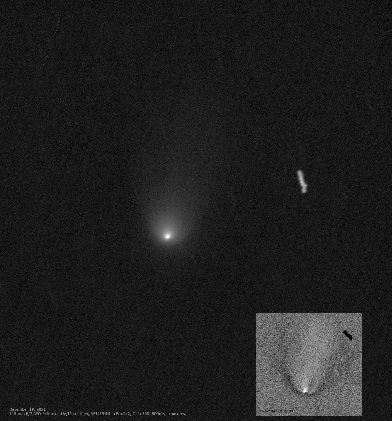 Comet Leonard on December 21, from suburban skies and with the comet going from approx 3 to about 1 degrees above the horizon. Using a multitude of frames (125×2 sec at gain 250, 200×2 sec gain 350, 65×10 sec at gain 250) and applying the Larson Sekanina algorithm, some details in the inner coma are visible, lie a bow-shock just in front of the nucleus and some inner jets pointing towards the tail.