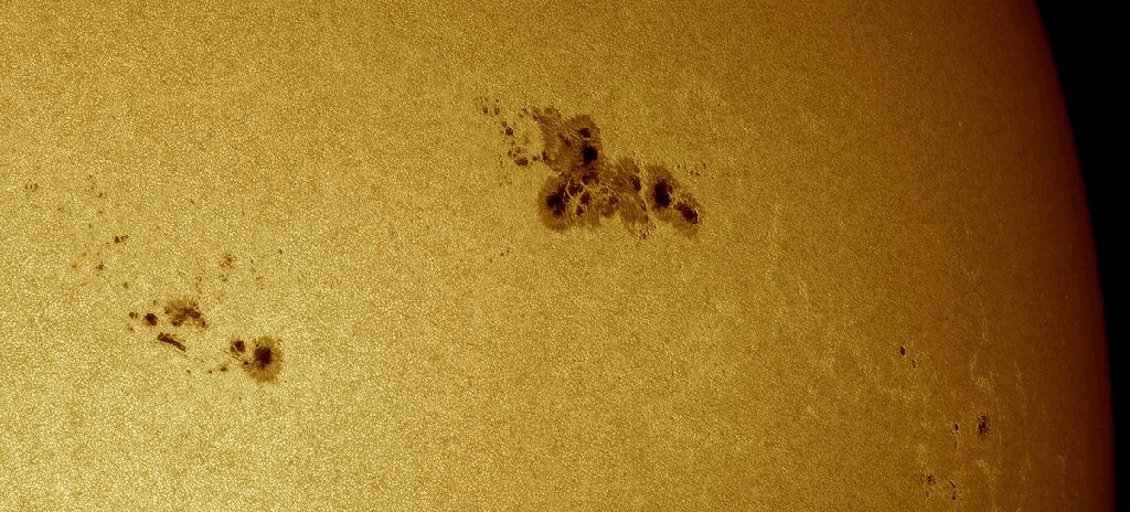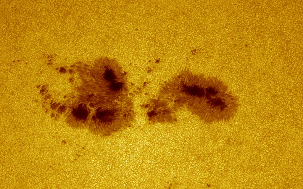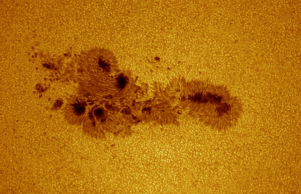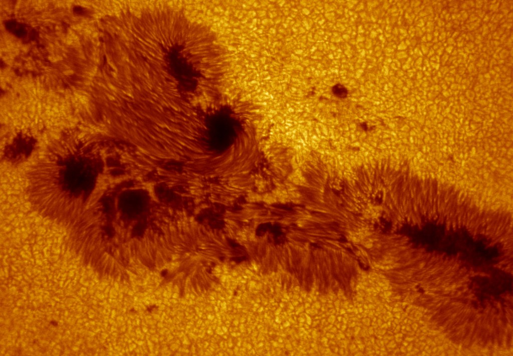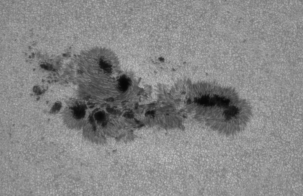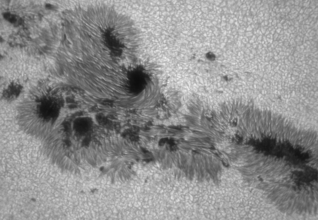 The large and complex sunspot group AR3014 on May 20. Images acquired using a 355 mm Newtonian, Baader Astrosolar and Continuum filters, ASI 174MM. Seeing 5/10. Windy.