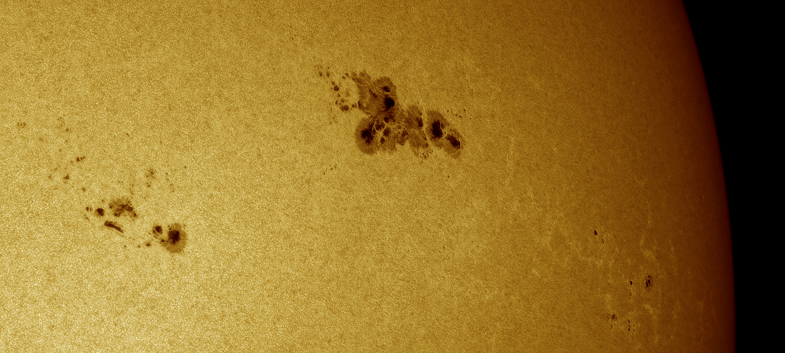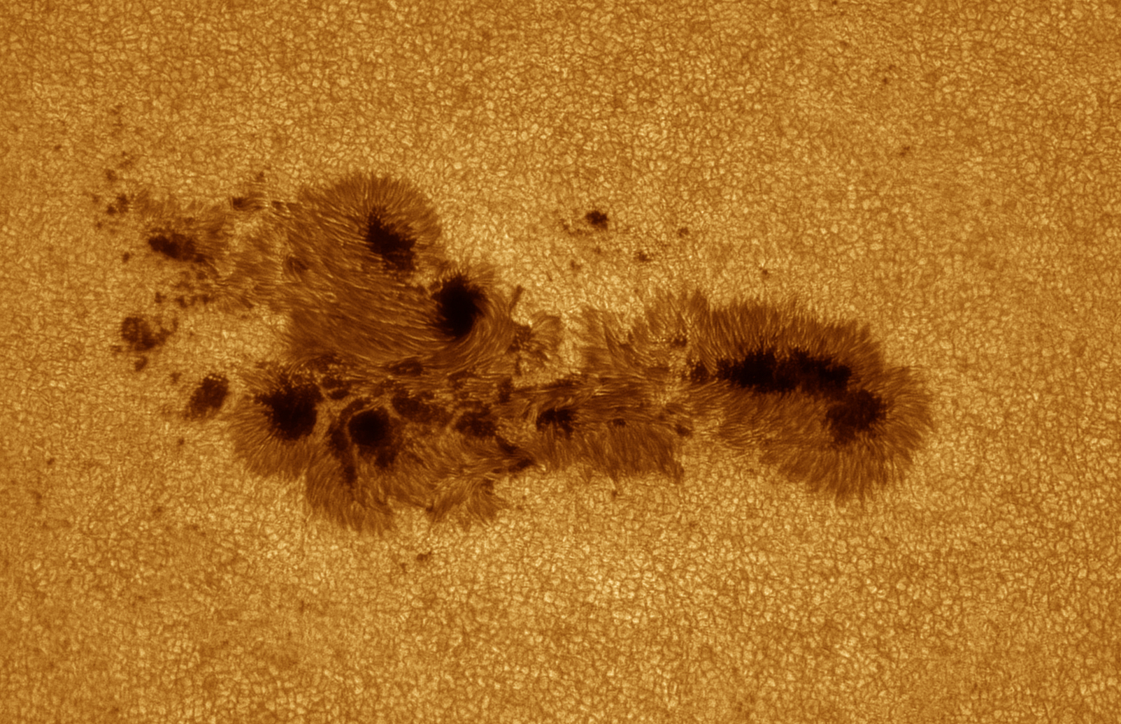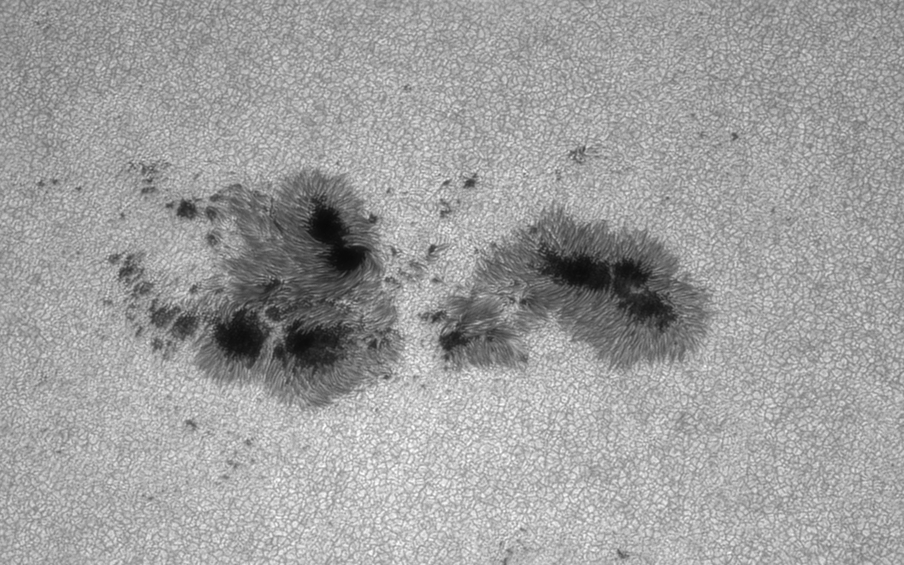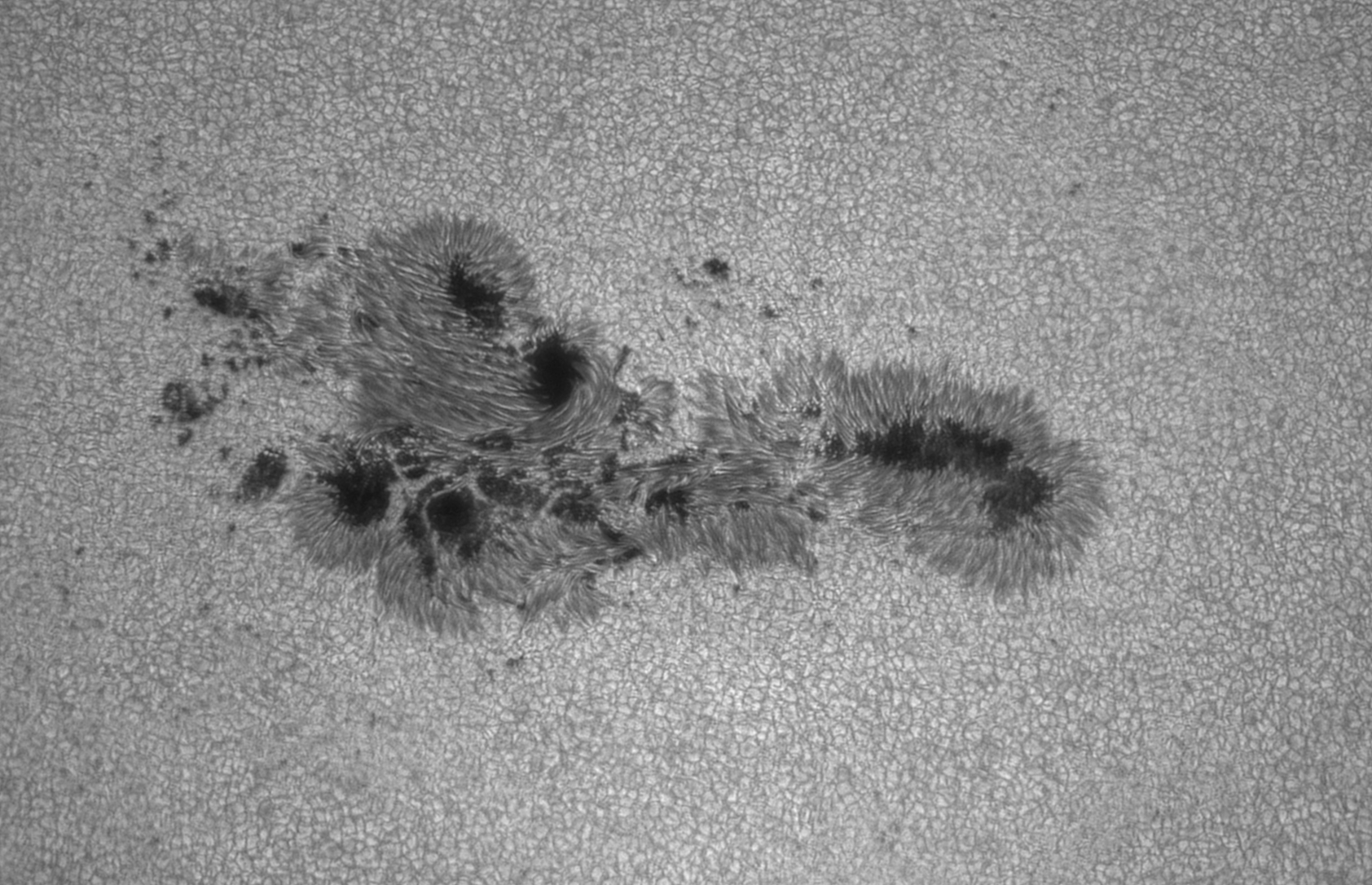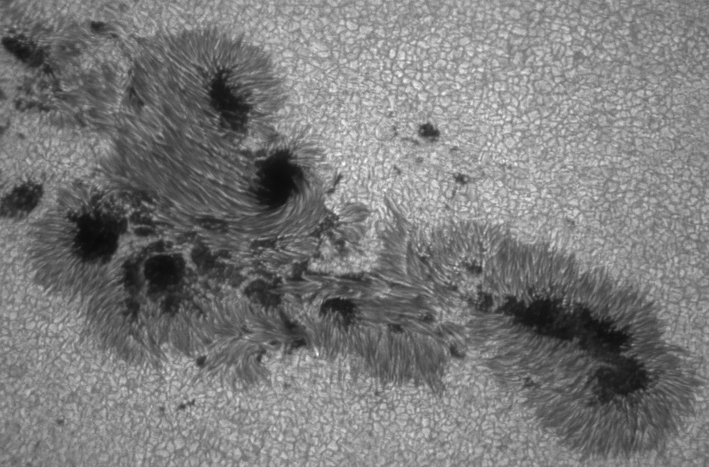 The large and complex sunspot group AR3014 on May 20. Images acquired using a 355 mm Newtonian, Baader Astrosolar and Continuum filters, ASI 174MM. Seeing 5/10. Windy.